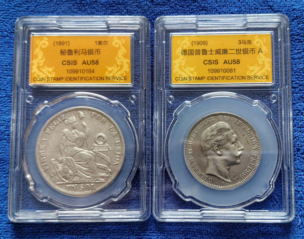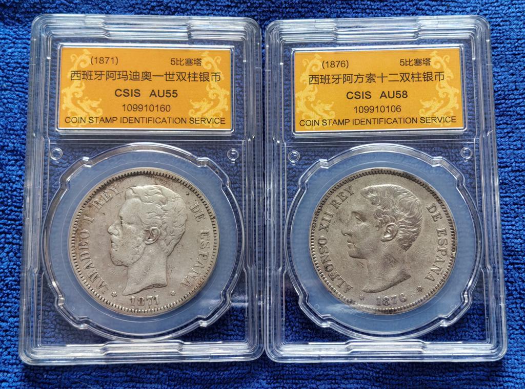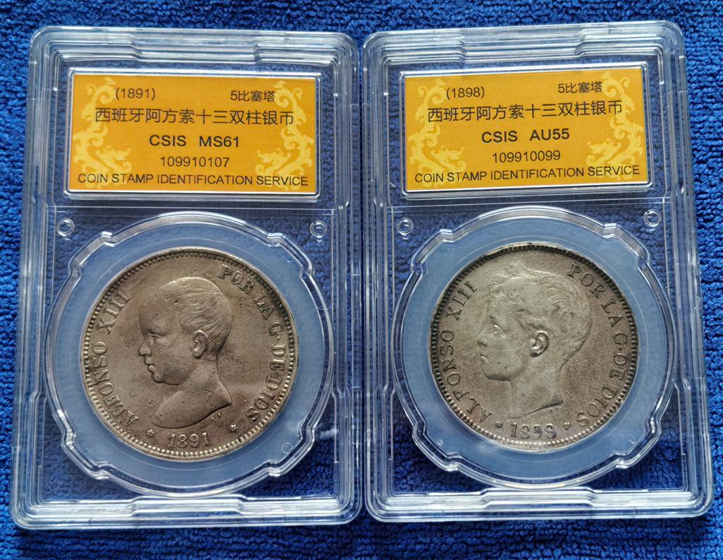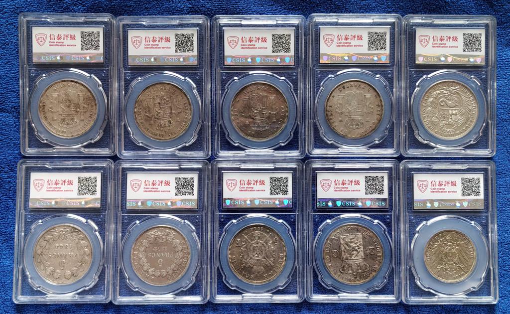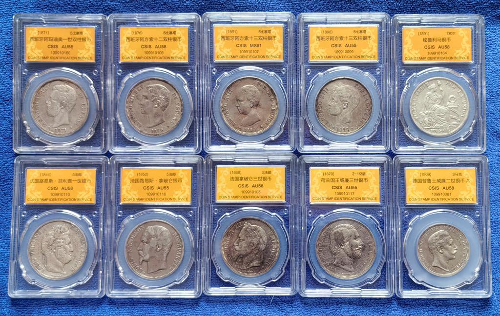 批量评级好品高银欧美老银圆 十枚,含西班牙5比塞塔双柱4枚/法国5法郎3枚/荷兰、德国、秘鲁老银圆各一枚(年号版别各不相同) 含银量均在900以上,信泰评级AU55分以上具体为:西班牙阿玛迪奥一世/阿方索十二世/阿方索十三世(两个年号)5比塞塔双柱银币4枚,法国路易斯·菲利普一世、路易斯.拿破仑、拿破仑三世5法郎银币3枚,荷兰威廉三世2.5盾(含银量945,欧洲最高)1枚,1891年秘鲁1索尔银币1枚,德国1909年3马克1枚,其中前9枚资料标重25克,最后一枚(德国3马克)为16.67克。评级分数:AU55分4枚,AU58分5枚,MS61分1枚。全部信泰评级,保存状态不错,适合钱币爱好者收藏。价格已是原料银价加评级装盒的成本价,只出让给珍惜它们的钱币收藏爱好者,大刀砍价毁币铸条者请绕行!。