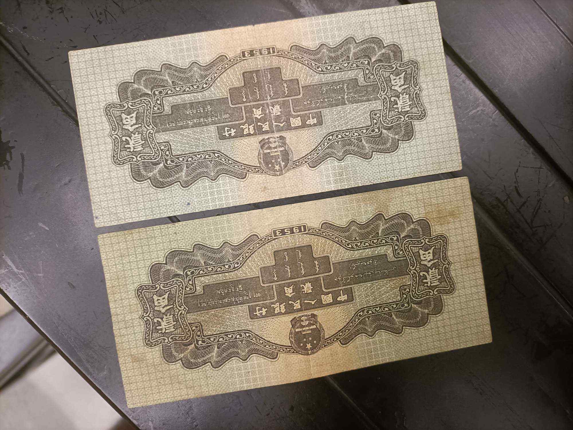 第一张疑似过水 有微口,版硬。第二张原票无口。