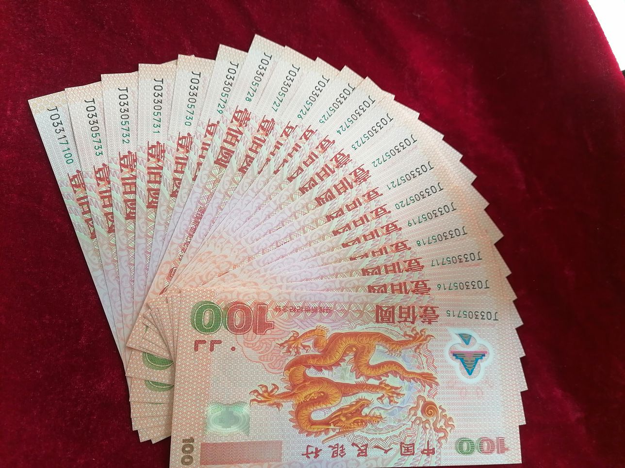 龙钞20张,有19张连号,其中有一个标准10连号,无折无波浪无掉皮,卖:1550元/张