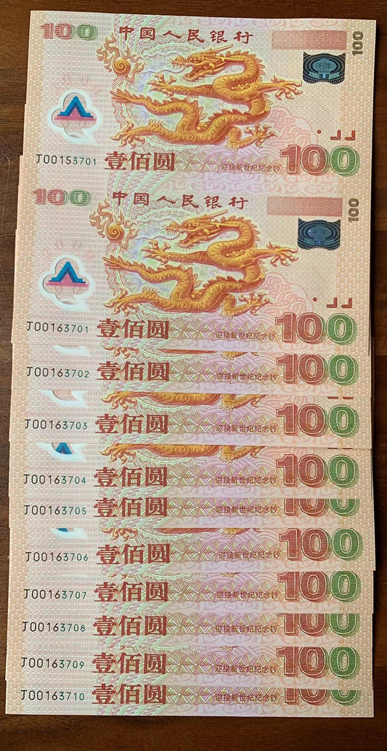 双龙钞10连,上钞号J00153701-3710,下钞号J00163701-3710,证书073701-073710,全程无4,价格12300元/张