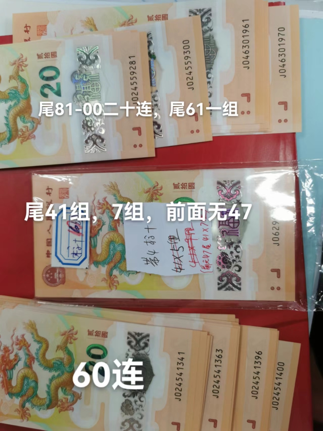 翻出16个标十,含带4一个六十连(内有81/91组),一个二十连(尾81/91),41尾7组(都是前面无47尾41,尾号应该大部分有一张是无47)流通好品,,苛求勿扰。当散钞卖,160*49元每张=7840元不还价,包顺丰或者京东陆运。