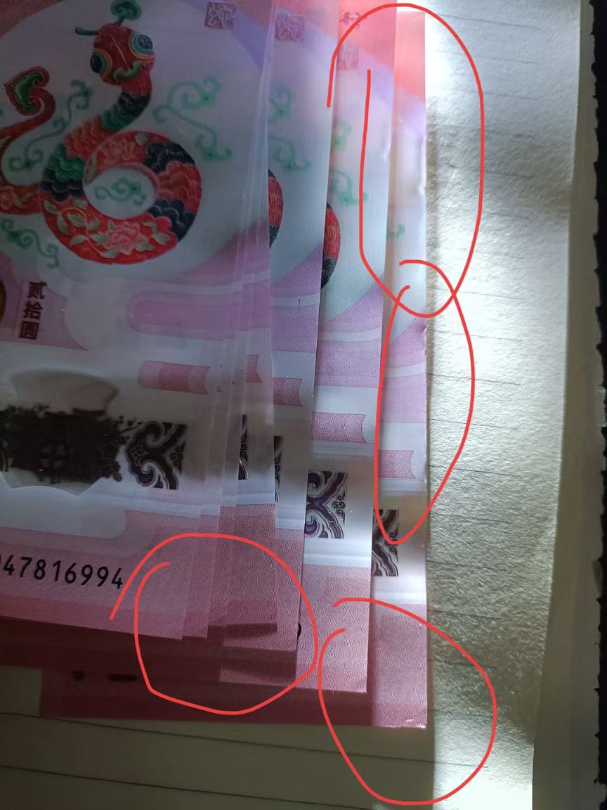 实物如图,蛇钞901一刀,4500处理包邮顺丰,挑剔者勿扰,后面2张一侧捆印,尾994到999角轻微痕迹,000角轻微磨损,如图