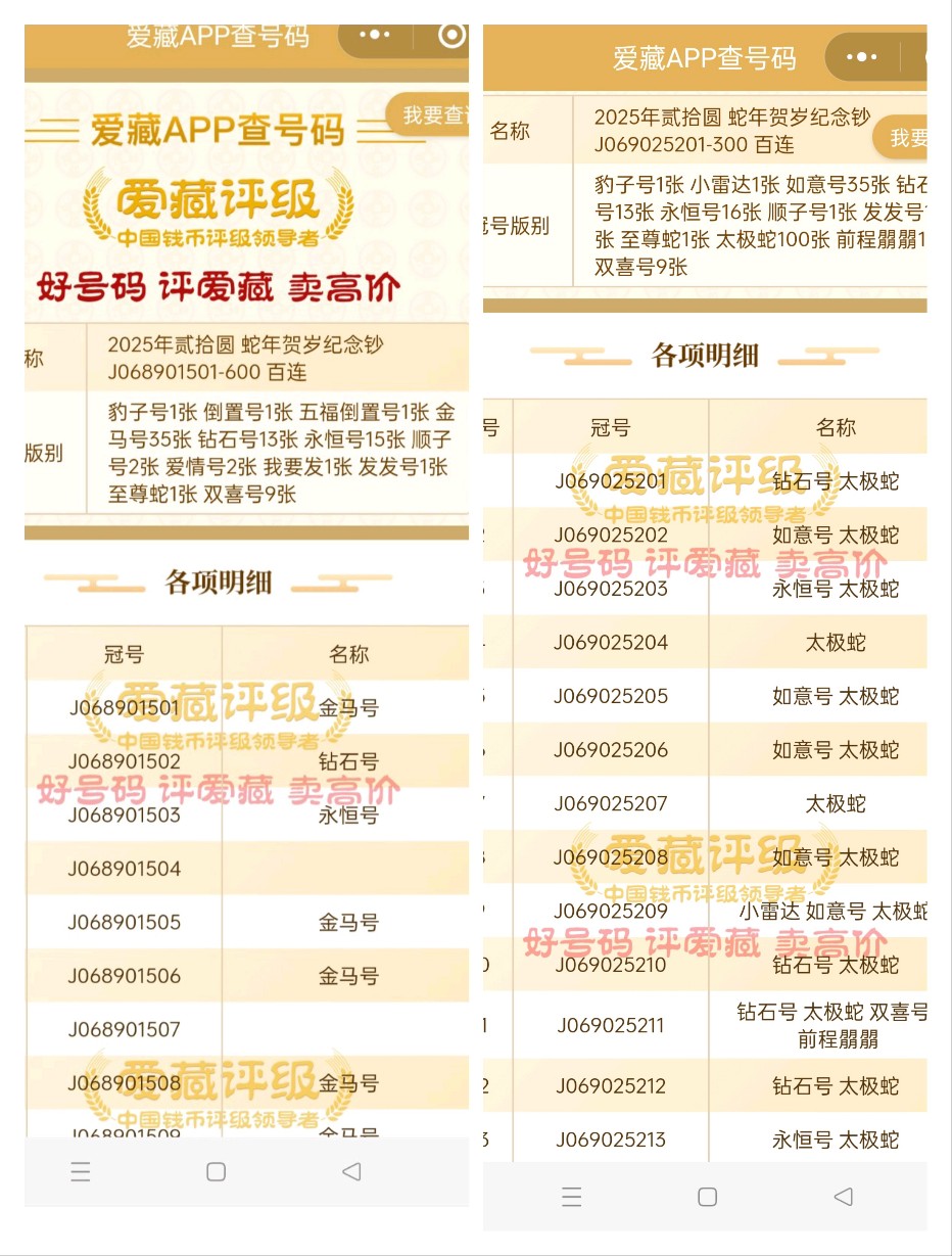 069025201如意标百售价:12500,068901501金马标百(最后一张是倒置号)售价:14000,一起通走,多网同售,电联确认!