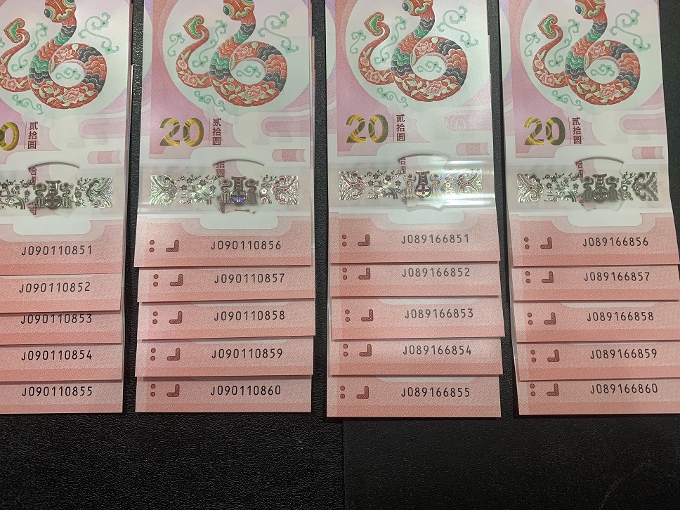 出售蛇钞无347标十2组,绝*品号段如图:含金马号、倒置号。售价900元/组*2=1800元,三包到手!