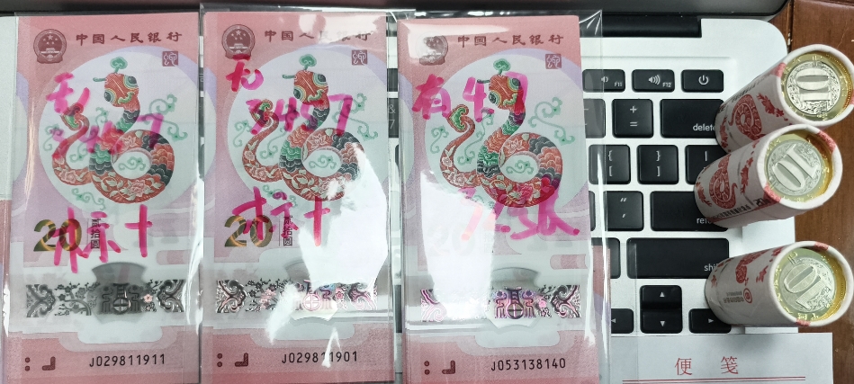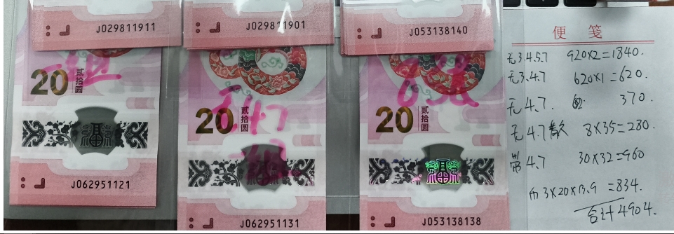 → 出蛇钞2组无3457,1组无347,1组无47散张40币3卷