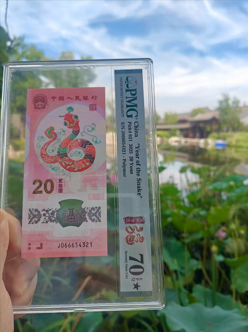 蛇钞!J066654321!顺意灵蛇第一顺子号!所有生销钞以J0开头!2024年龙钞北京发行的是J0999开头!2025年蛇钞南京发行J0666开头!PMG70分大黑星!欢迎带价交流!