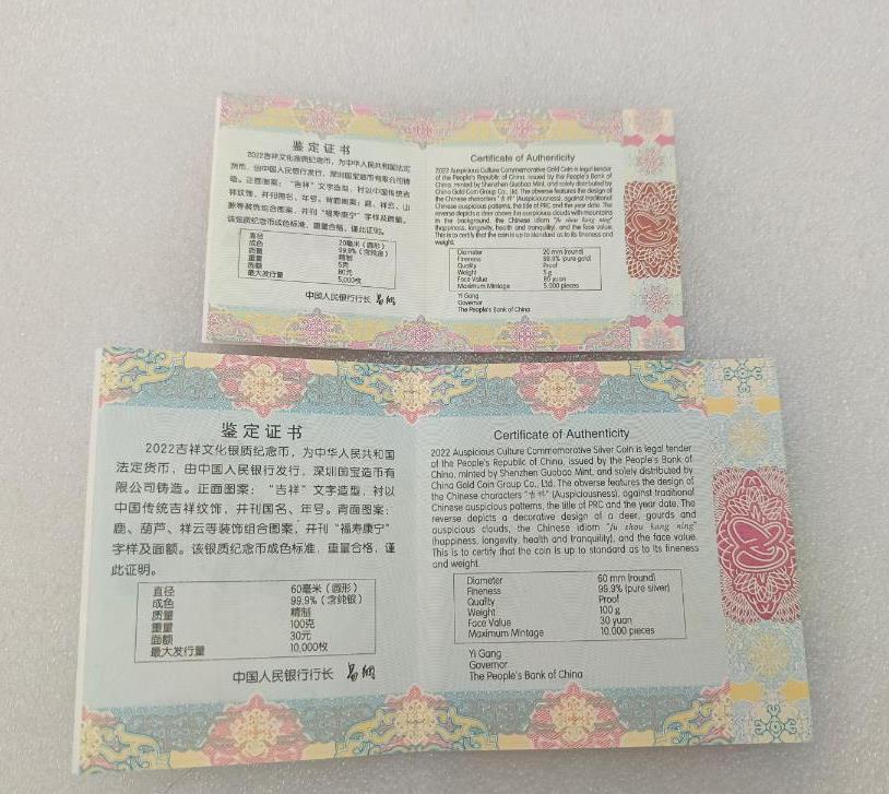 金币含纯金5克,银币含纯银100克,带原盒证书,价格6000元!