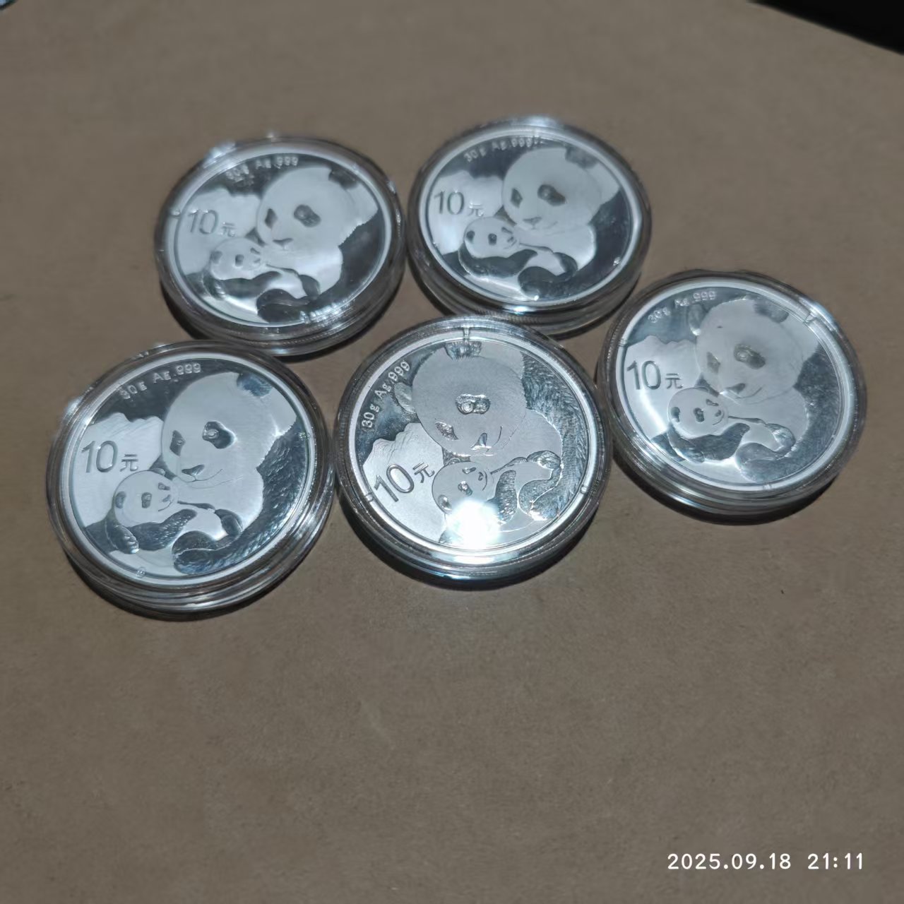 按银价出2019年熊猫银币5枚全国便宜出 有的有指纹。 都比银价便宜比收购便宜8元了,292.99元全要包邮,单要邮费另议无说明书。