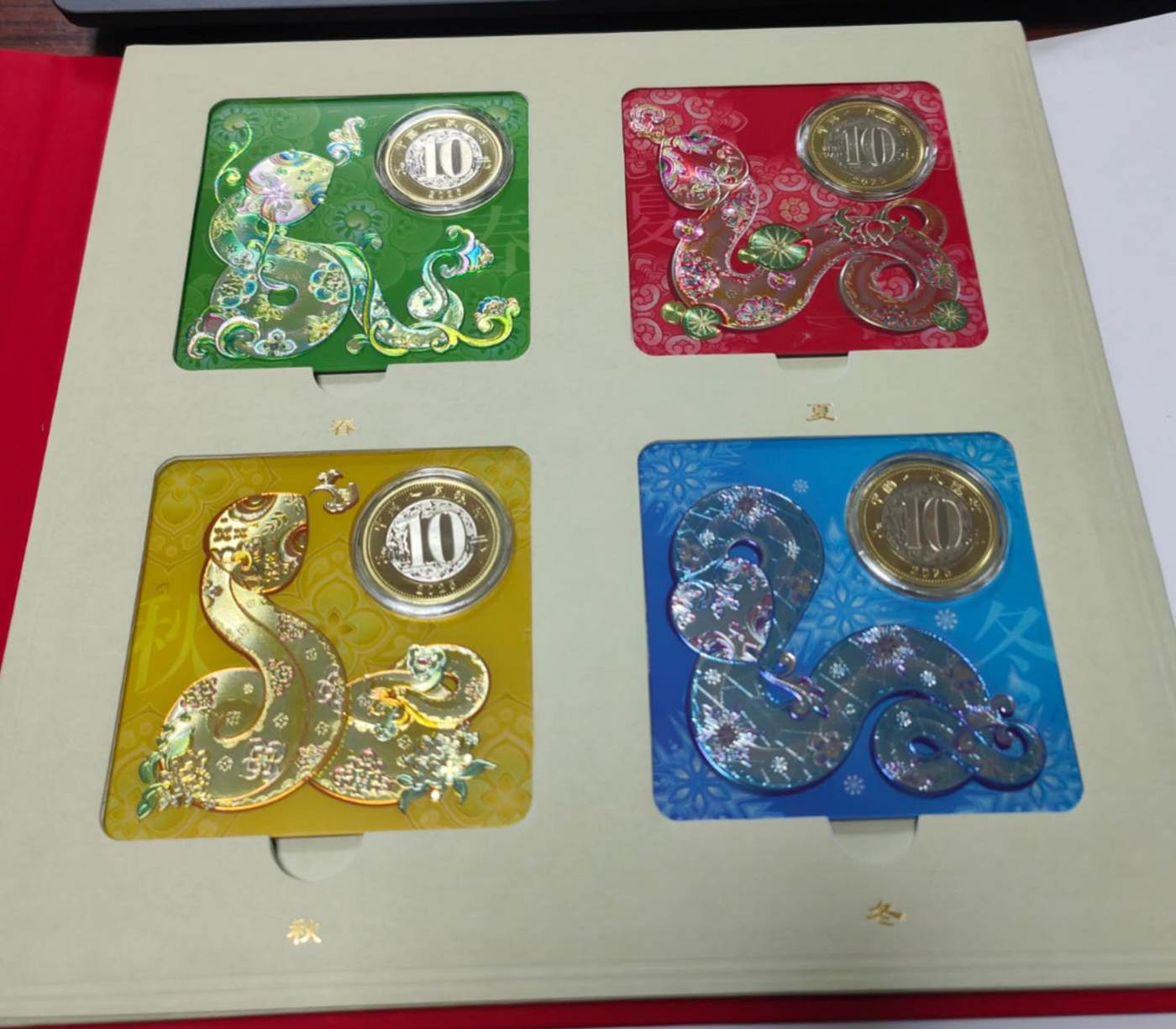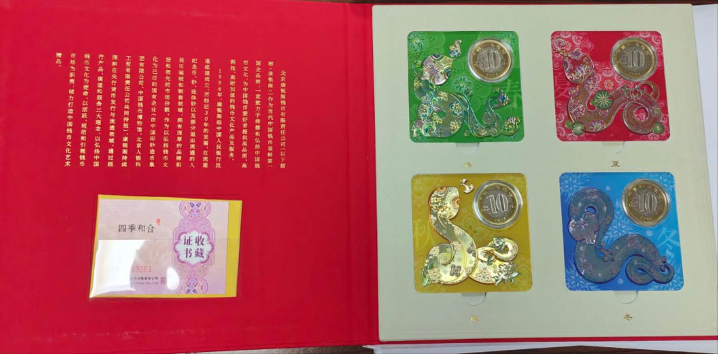 内含蛇年装帧纪念币春夏秋冬4枚,4张证书(很多编号是无47或无347的)。