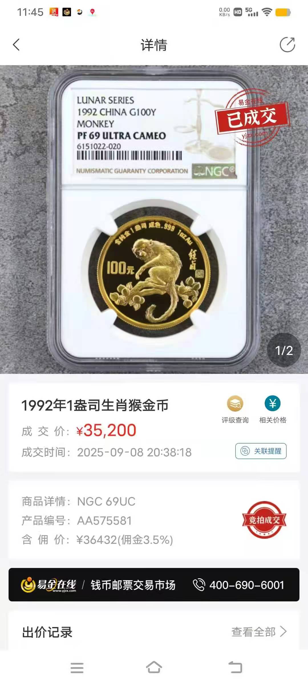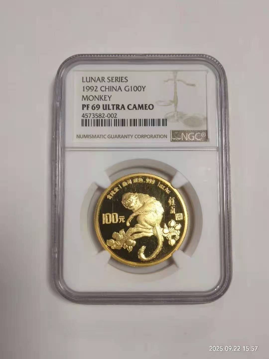 一盎司生肖猴金币,售价34000元,没有证书。