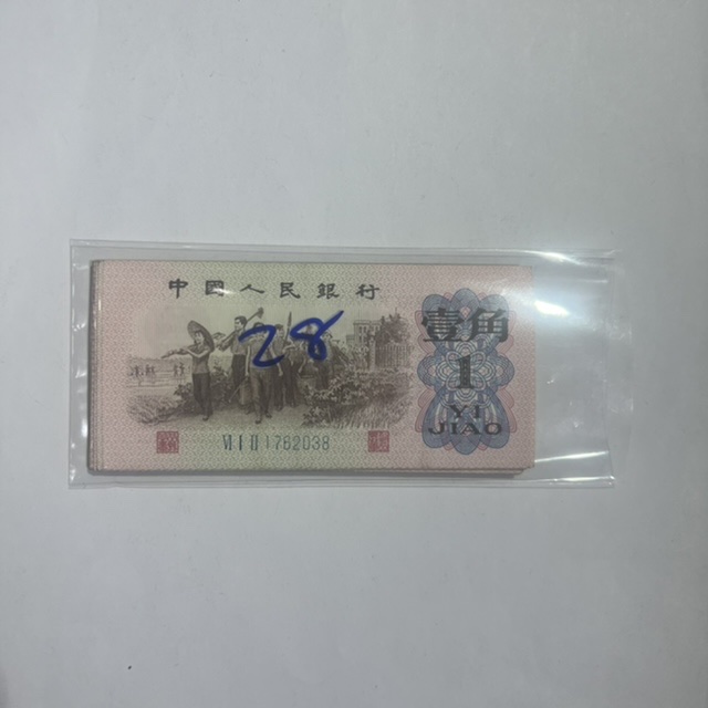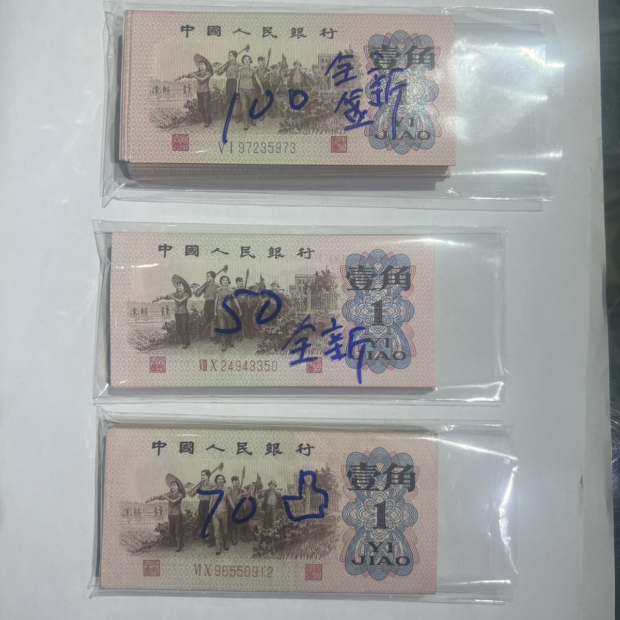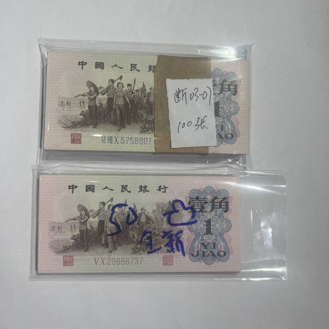 图一:下乡蓝壹角百张断03-07,九个标十,红二凸全新50张,此一图二种150张一起11/张。图二:全新蓝字100张,二平50张,二凸70张,此二图共220张,7.5/张。图三壹角28张,6/张,需要请联系!