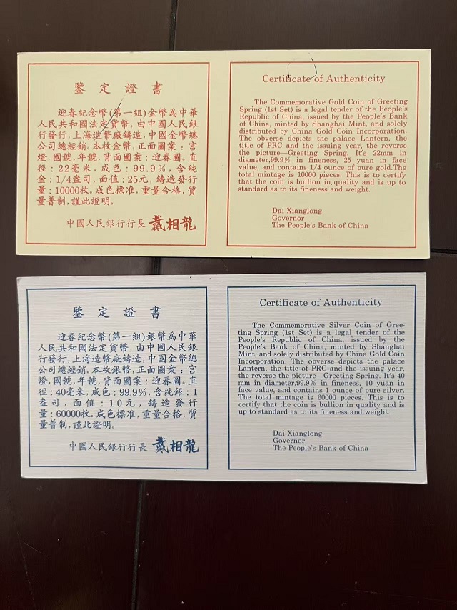 97年迎春图一组金银币1盒,金:1/4盎司;银:1盎司,
