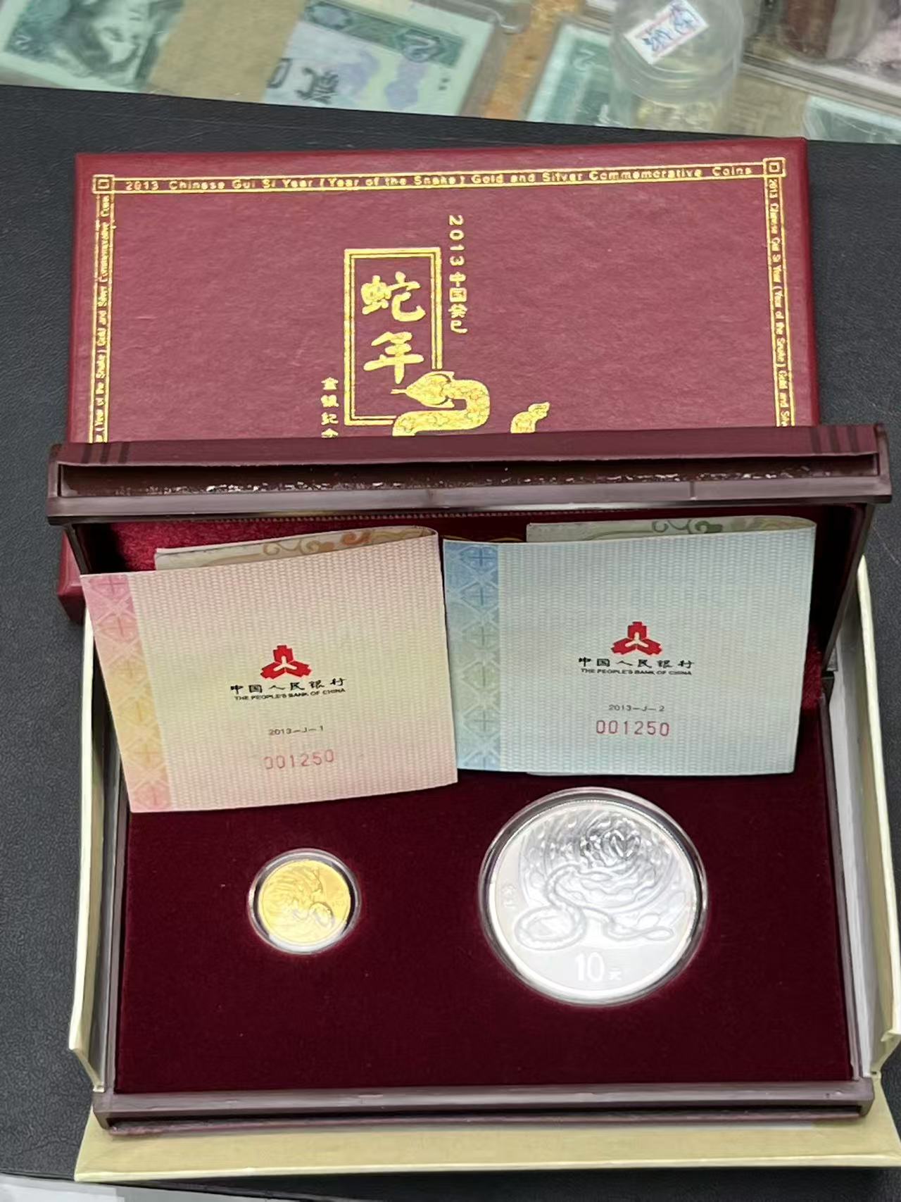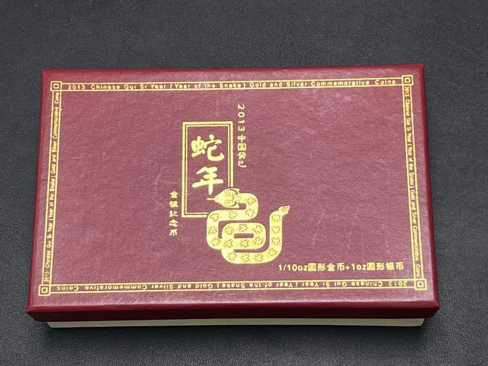 13年本金银蛇,金币十分之一盎司3.11 克,银币一盎司31.1 克,原盒原证号001250,售价3180元。