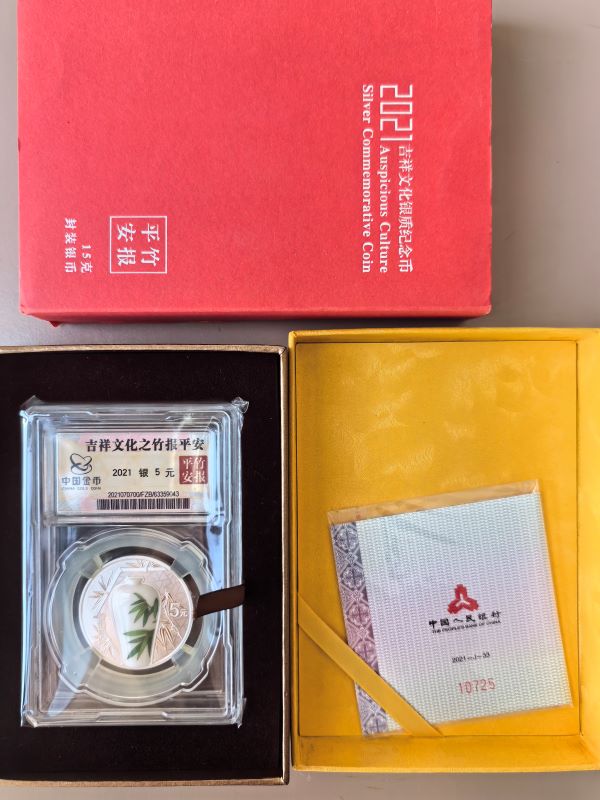 很漂亮的一枚首次镶瓷片工艺的银币,竹报平安寓意好颜值高,金总封装限量发行,配件齐全非银套拆。带红皮套,证书无47.一枚780包邮
