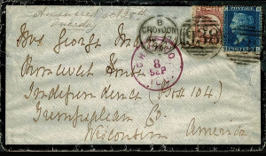 贴蓝便士和维多利亚半便士一枚,英国寄美国实寄戳 1879.8.27英国克罗伊登-1879.9.8美国芝加哥
