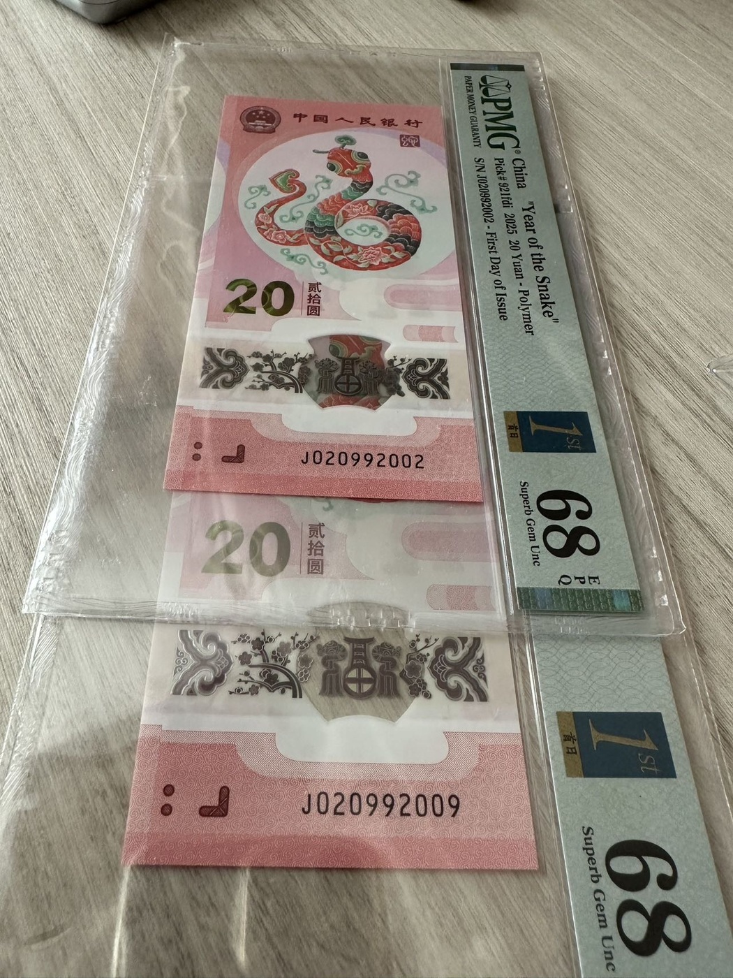 便宜出精品小龙钞PMG68分尾95,龙两张16000元送全同号蛇,蛇钞圆圆95,金马王尾95,