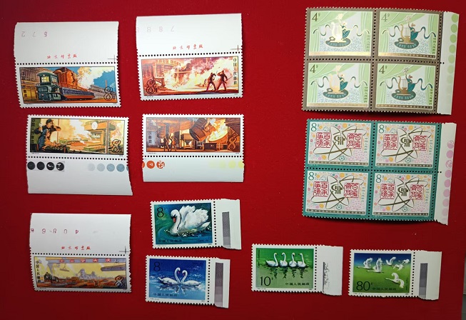 钢铁色铭,原胶过灯全品,一5边纸有点极微黄,80元。文代会,色方,原胶全品金亮,66。天鹅色标,35。