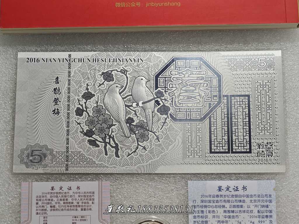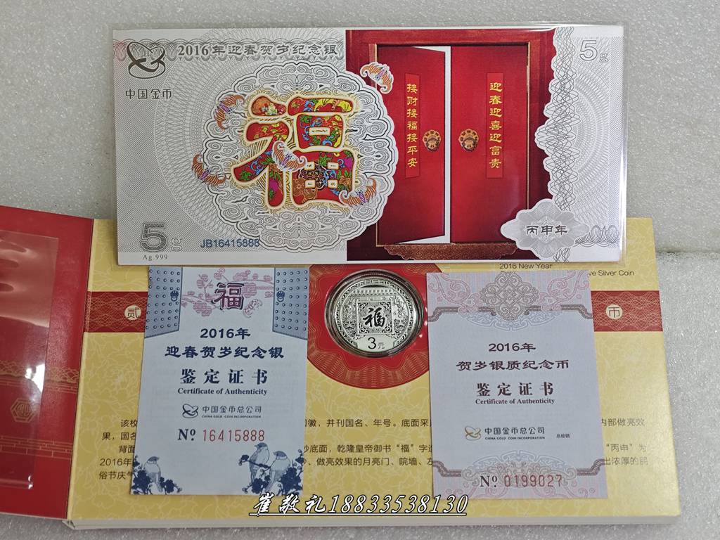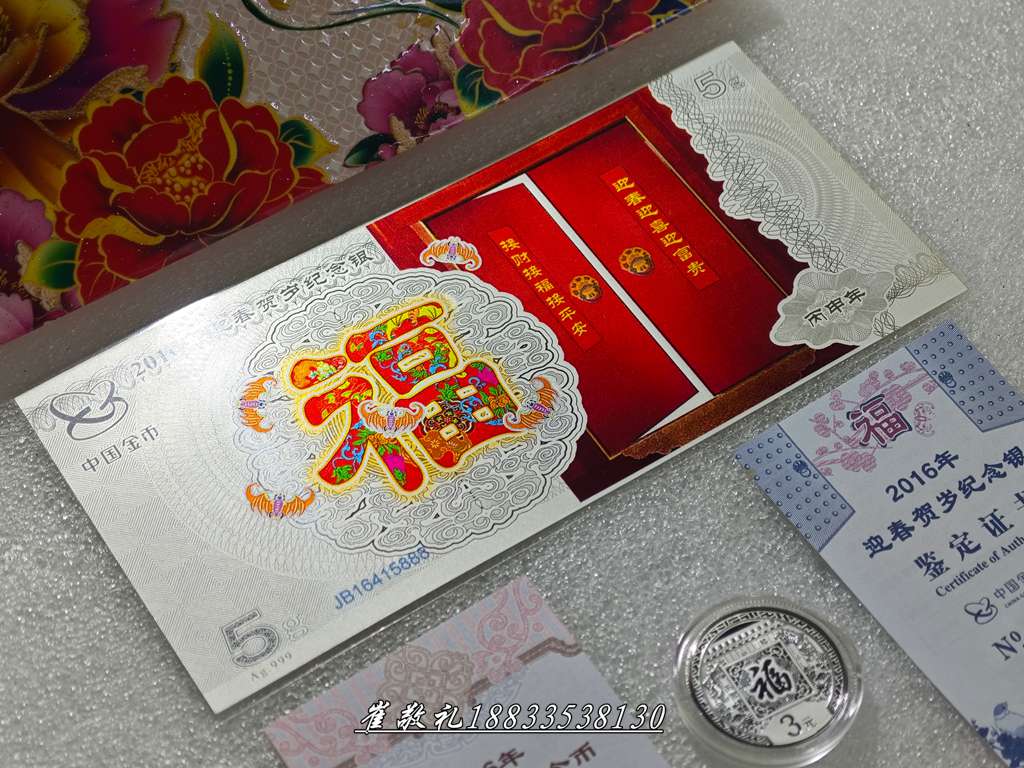 2016年福字贺岁银币带同年5克纯银福字纪念银钞1套证书册子齐全无封套,证册完好 币无磕碰无划痕正常淡金彩氧化 见图,价:199.9元包快,本人四十八小时无操作视为撤贴!