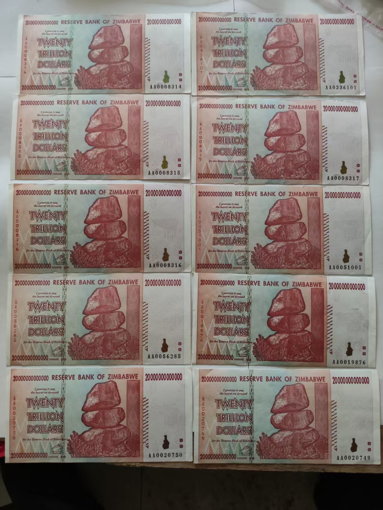 津巴布韦 面值20万亿,近全品10张,1500元。