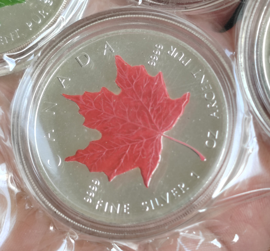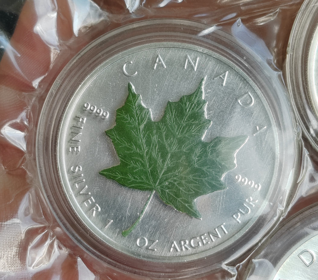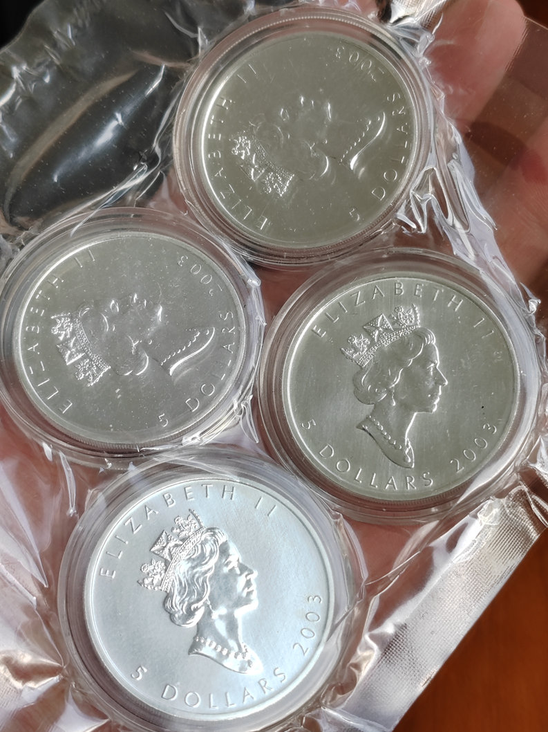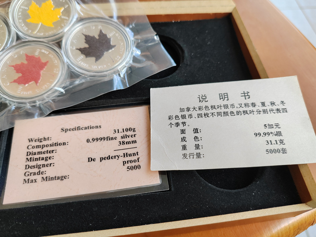 加拿大 2003年 1盎司枫叶银币4枚 加彩春夏秋冬。含银.9999,币全品无氧化, 象征春夏秋冬的四色不知道是趣味加彩还是原厂生产的,到手自己加了真空袋子,如需要看币细节可以私聊,370元一枚,三包到手。