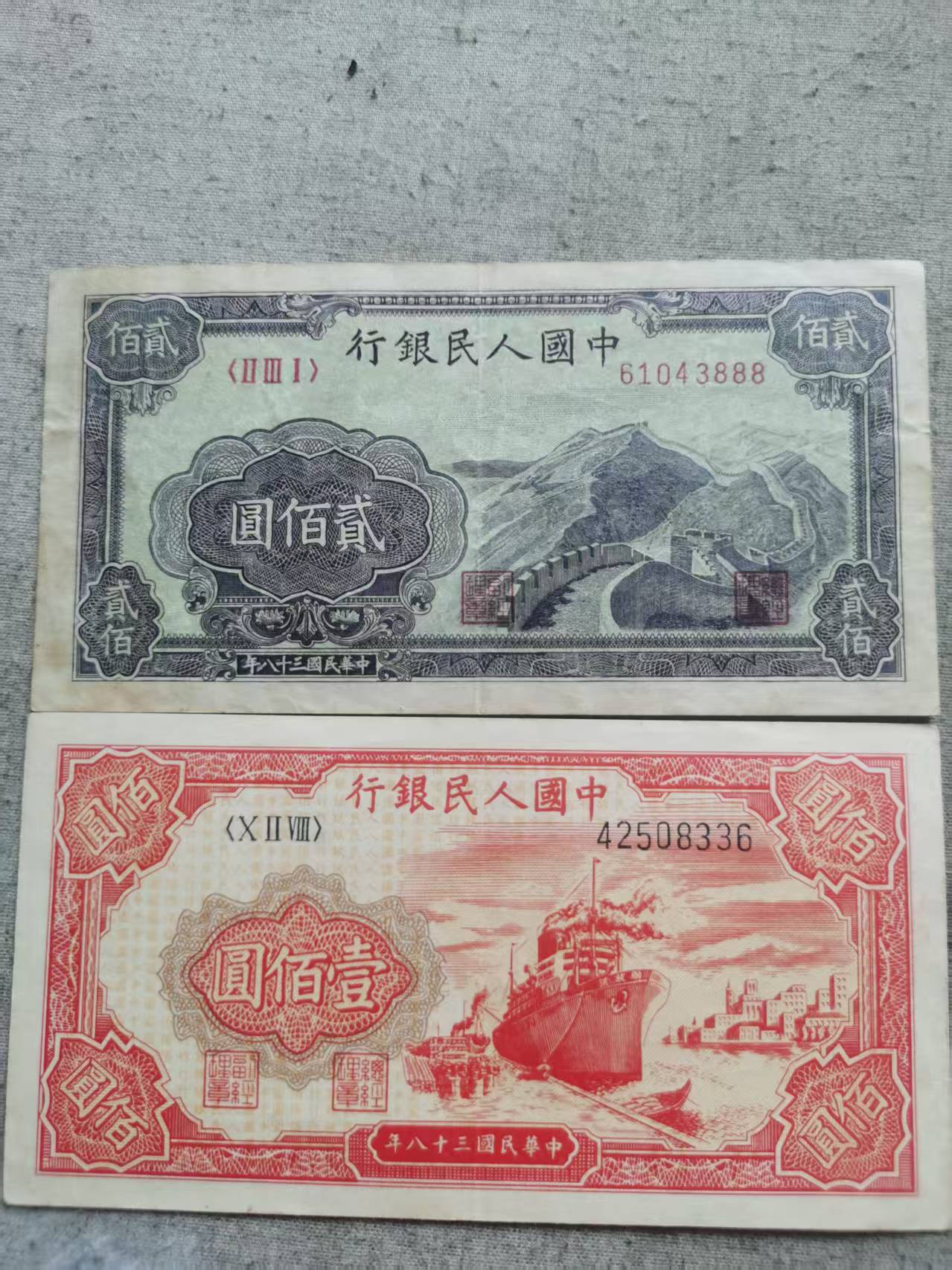 一版币好品两张.轮船一张.长城一张.