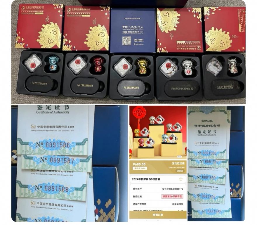 → 出一套五枚2024年3元贺岁五福龙.证书五连无347含尾88