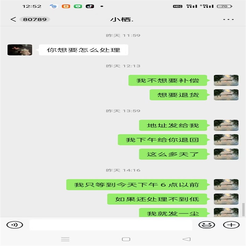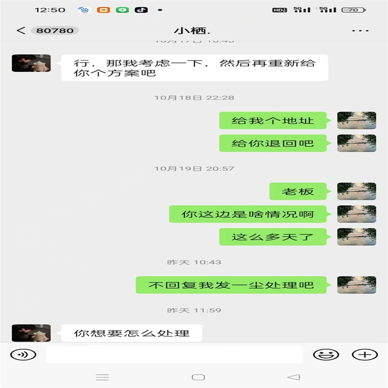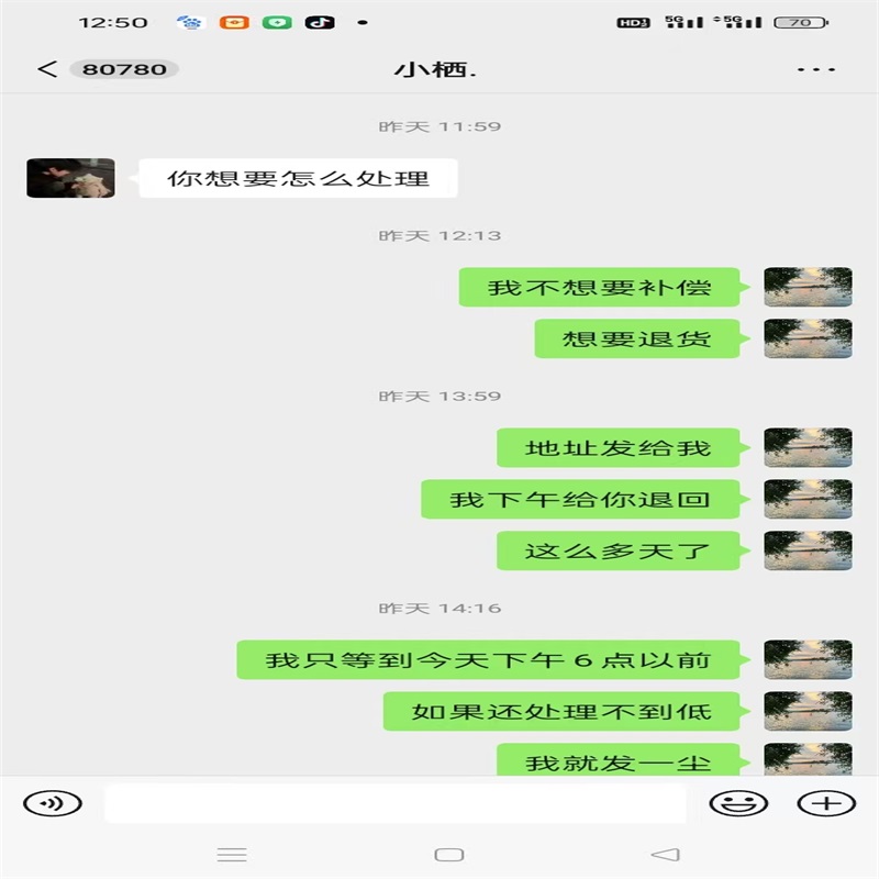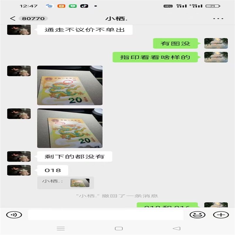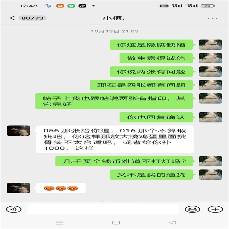 收到货我就联系卖家,跟卖家说明情况,实际品相和描述不符,卖家说的是两张有印,实际上是四张都有印,不光有印,还不是原票压过没有凹凸。我跟卖家说要退货,卖家是各种理由不退货、卖家说给我补点差价不想退货,他直接给我转来1000元,我没同意。然后卖家说他考虑考虑给解决方案、一等等了三四天卖家也不解决、今天推明天明天推后天