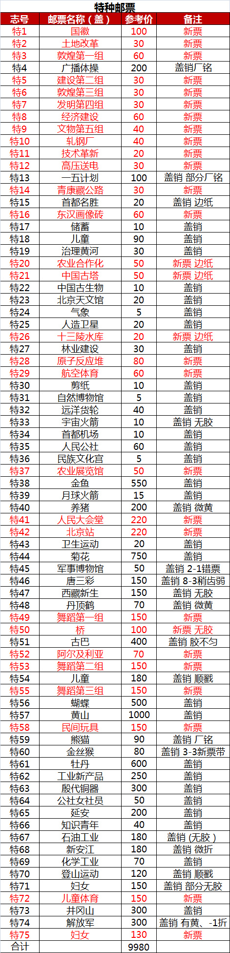 老纪特邮票新盖混大全套,上品至全品大全套。清单及参考价见表(单套价格仅供参考,不拆开卖)。参考价纪字邮票合计13080元,特字邮票合计9980元,共计23000元。现22500元包顺丰出售。老藏家精挑细选珍藏,干燥箱保存!大部分是新票和盖销票,少许信销票(见附表)。不含小型张与无齿邮票及纪3东贴。包含1949-1967年发行纪念、特种邮票。全部上品至全美品,无薄无裂,色正色艳齿完美。带华艺双膜豪化定位册,十分难得!