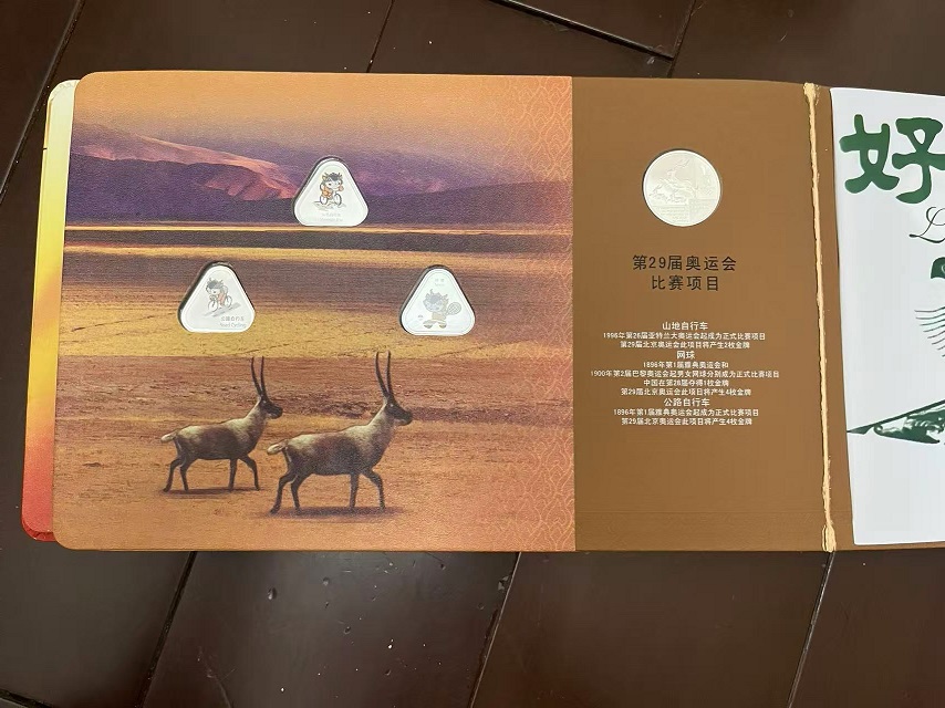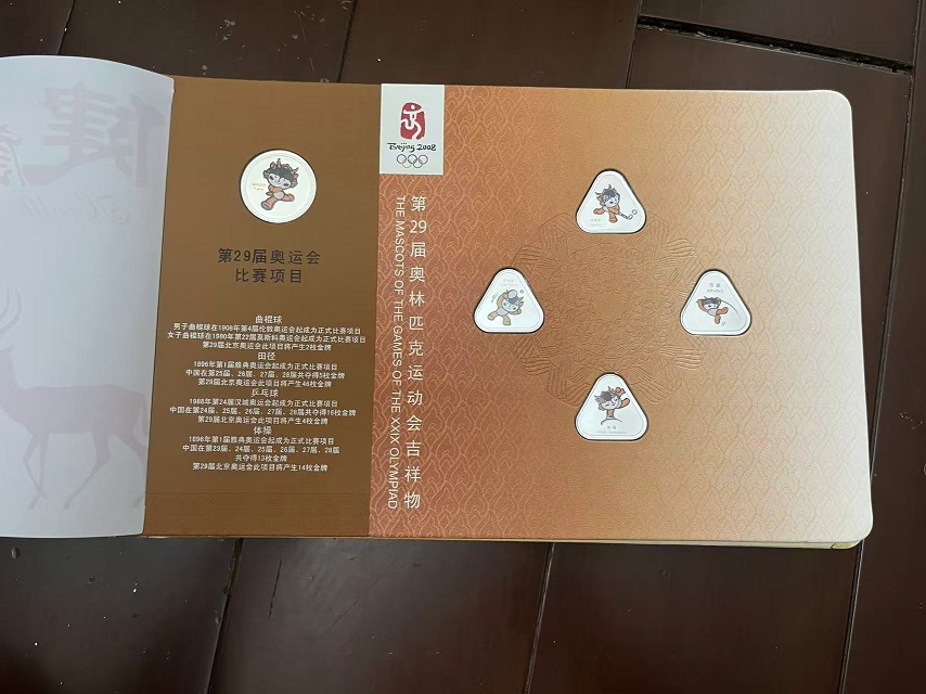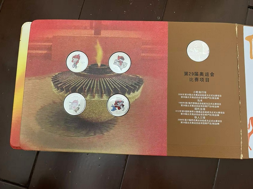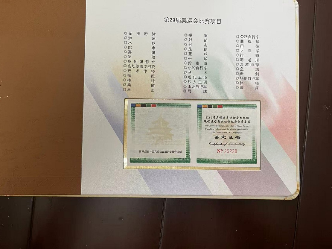 售第29届奥运会吉祥物运动造型彩色渡银纪念铜章26枚套装,有2本