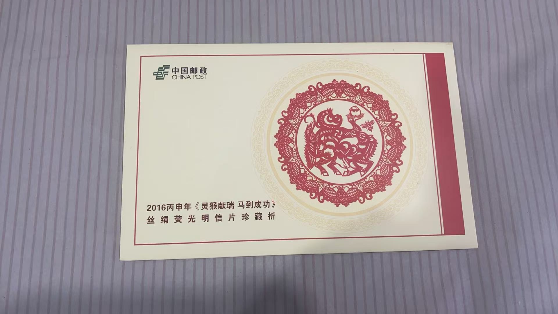 → 售丙申年《灵猴献瑞 马到成功》丝绢荧光明信片折