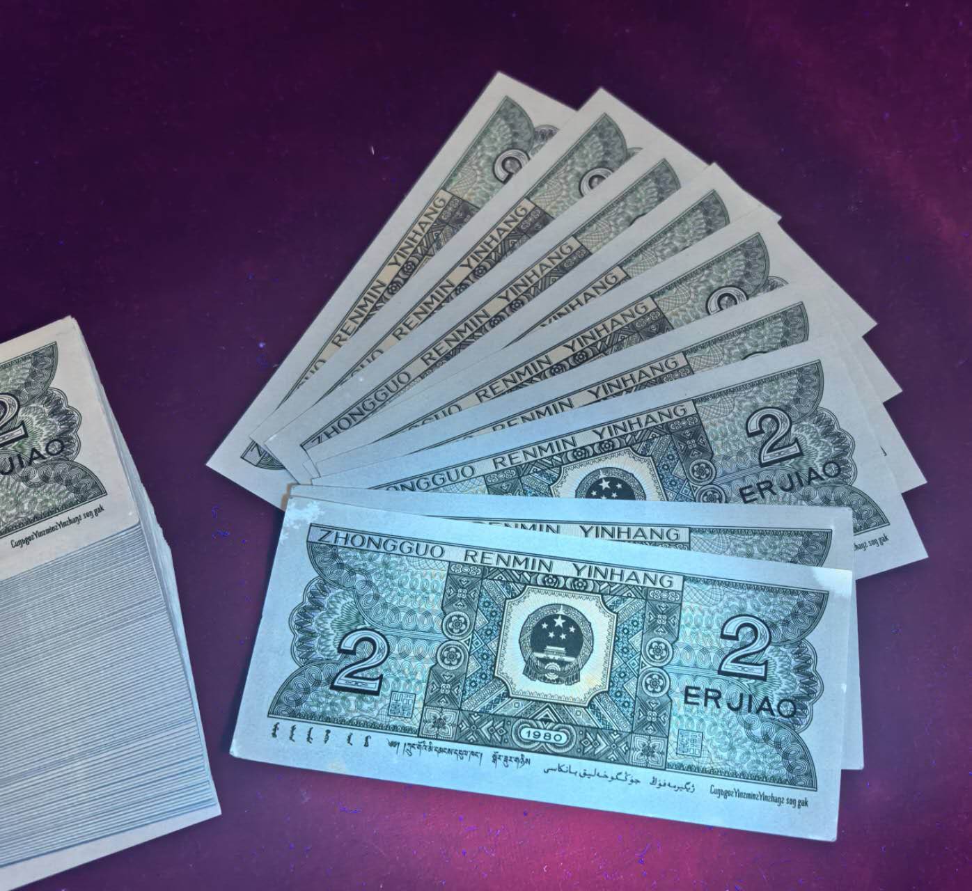 卖8002精制币一捆中的801一刀带9豹子号,全品百联,灯下无斑,豹子号000最后一枚角上有一斑点,售价700元