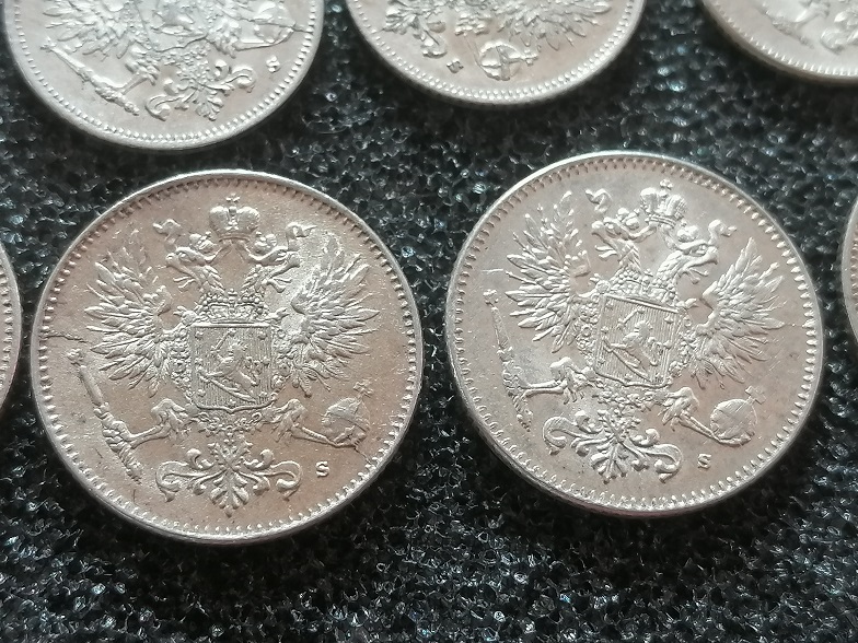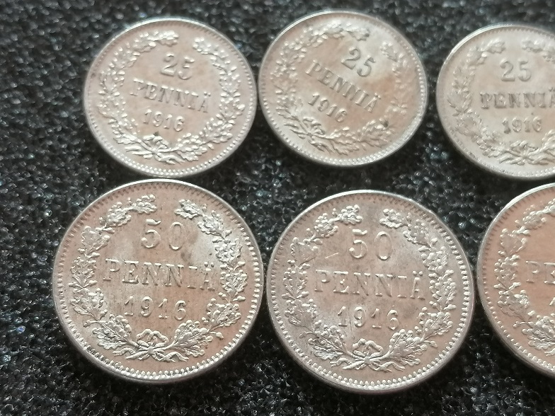 美品带光1916年俄占芬兰50芬尼银币、25芬尼银币5对;10枚齐售不分拆300元包普快!