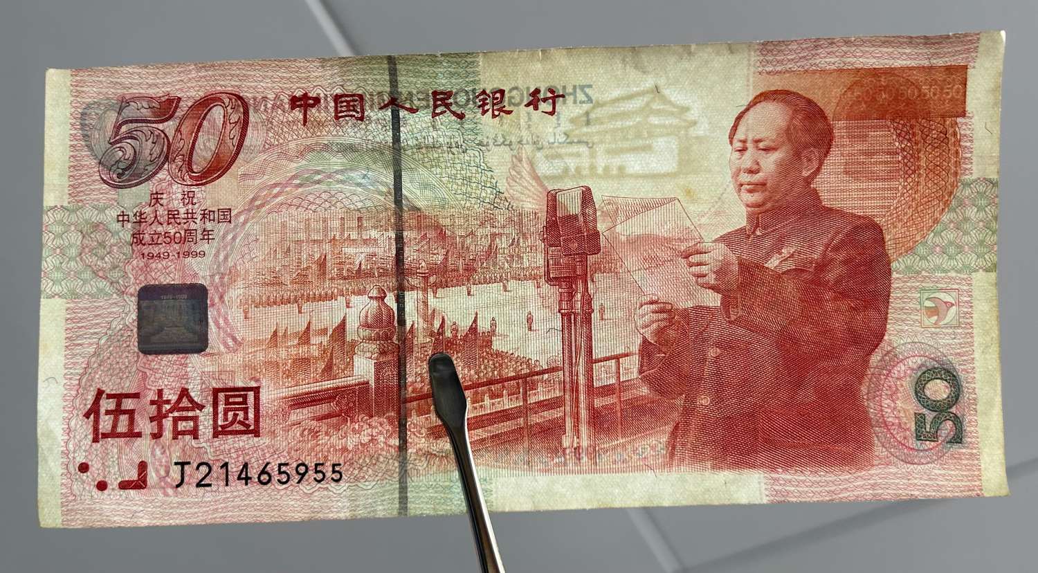 龙钞一张,号码J02949860,红圈处有轻微划痕,有轻微几个小指甲痕,没有漏印掉皮,售:960元