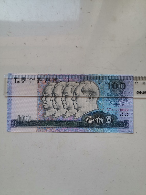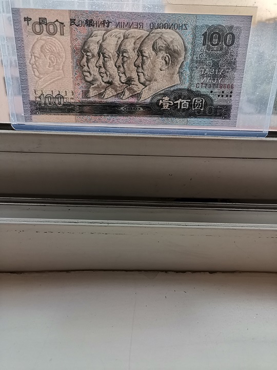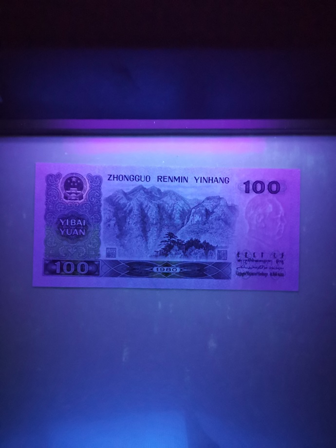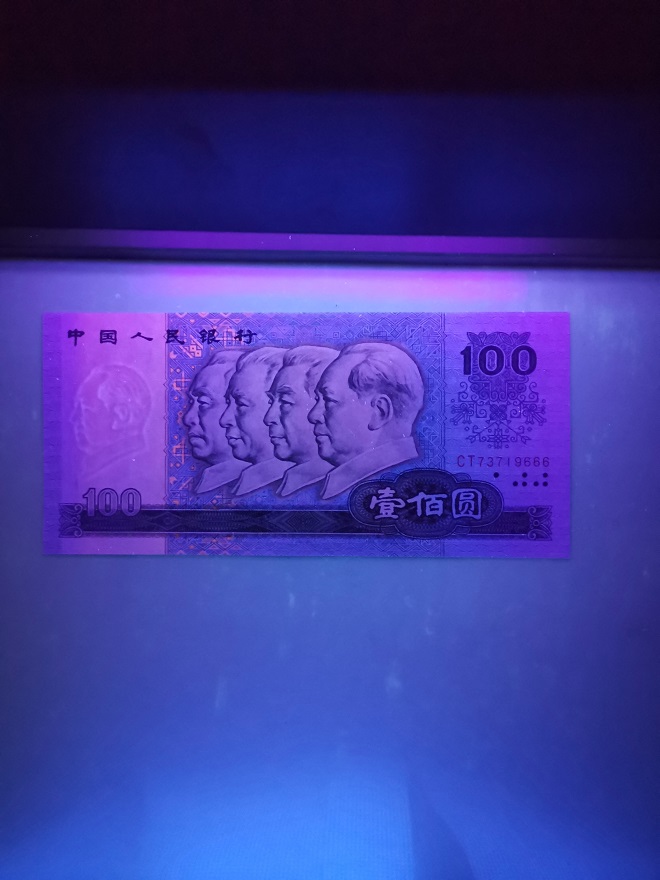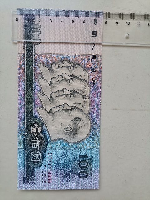 全新原票品如图,号码全程无4。长度超过标准尺寸1mm左右。同时又是“中国梦”荧光币,灯下效果非常漂亮,2100元。