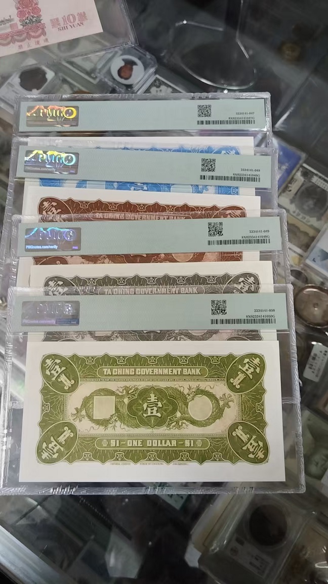 PMG评级大清银行兑换券壹圆面值一套4枚,一套4枚一起3800,单枚1800,正面雕刻凹版,背面胶版版,与清代原版图案保持一致,北钞发行,量少品好,刚评级回来,顺丰三包到手。