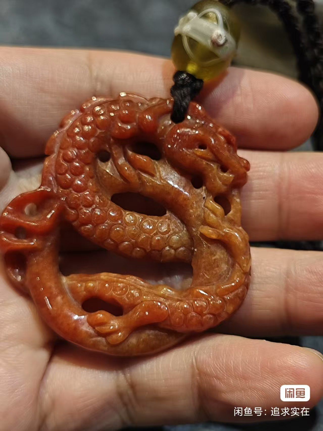 配老琉璃珠,龙身镂空雕刻,鳞片清晰立体。红翡色泽通透,雕工精湛,龙身造型生动威武。搭配精美琉璃珠,整体成色好,适合佩戴收藏。