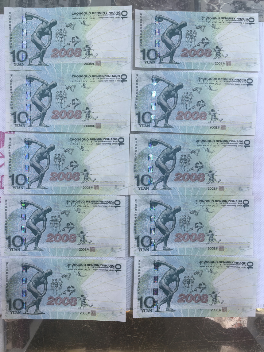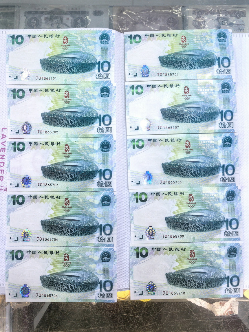 出奥运钞无3、4标十,号码、品相如图,无霉,售21100元/组,包邮,电联15580037365确认,微信同号