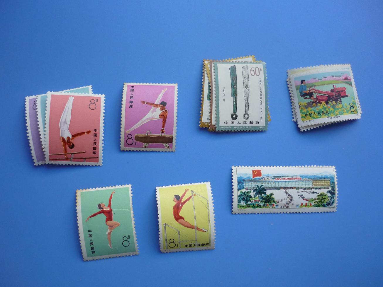 体操原胶微黄,-6轻微揭薄软折,-1硬折,-3缺角,其余三枚极近全品126,币一原胶微黄轻微软折42,农机原胶微黄-4轻微软折68,广交会原胶微黄轻微薄14,扇面原胶金亮有氧软折19,提供两套随机发,总理原胶微黄金氧软折27
