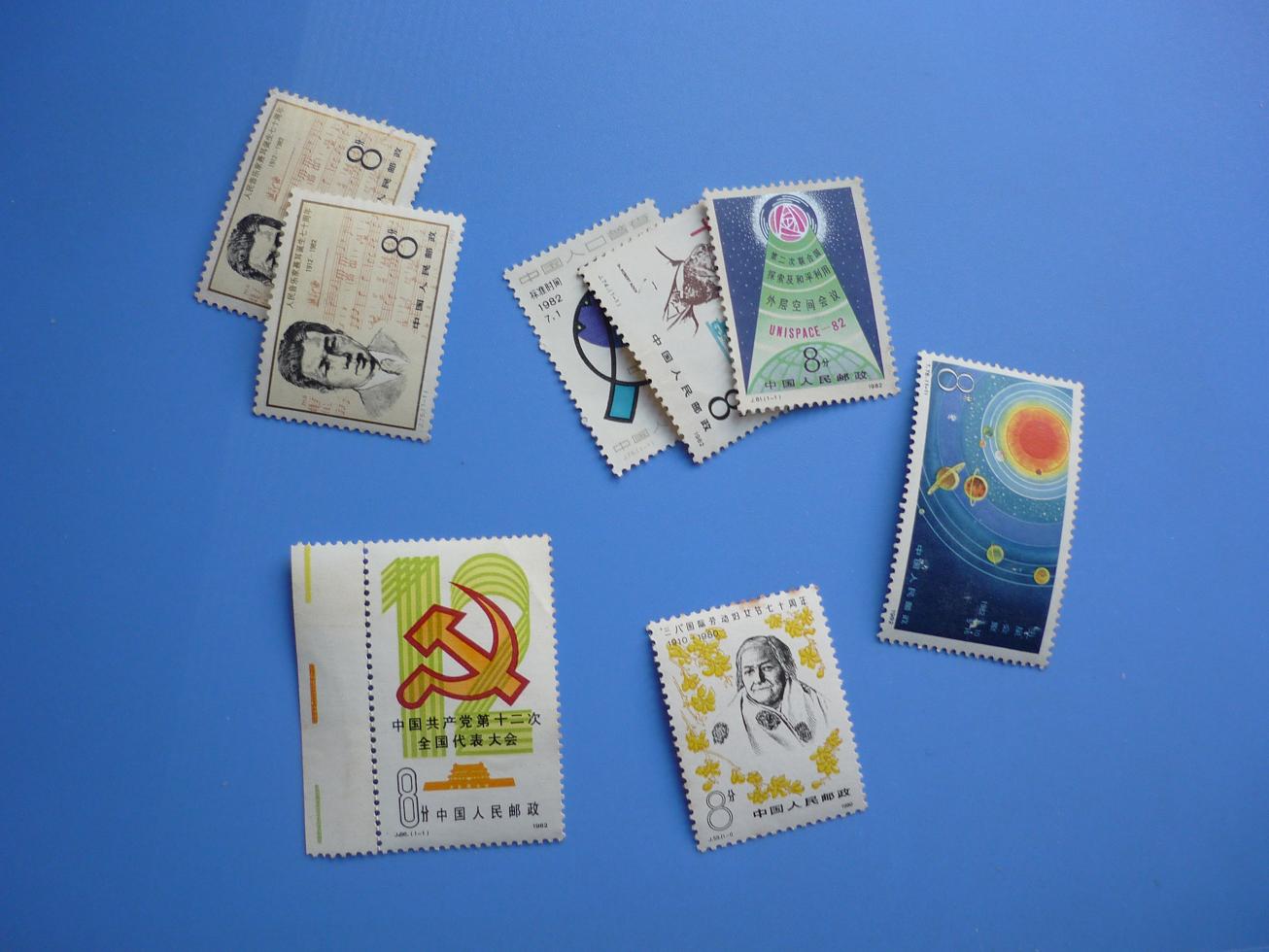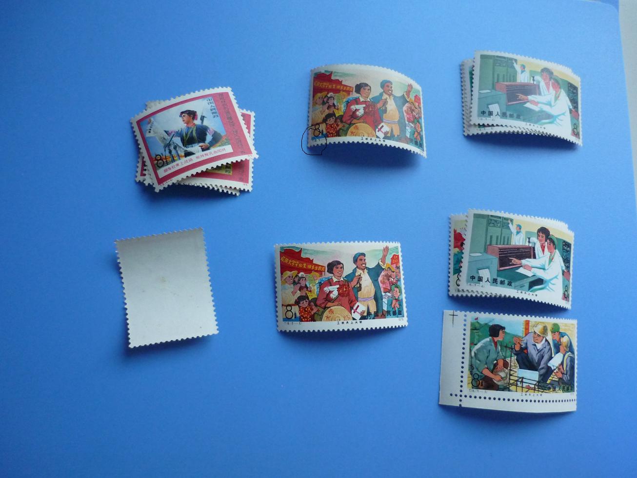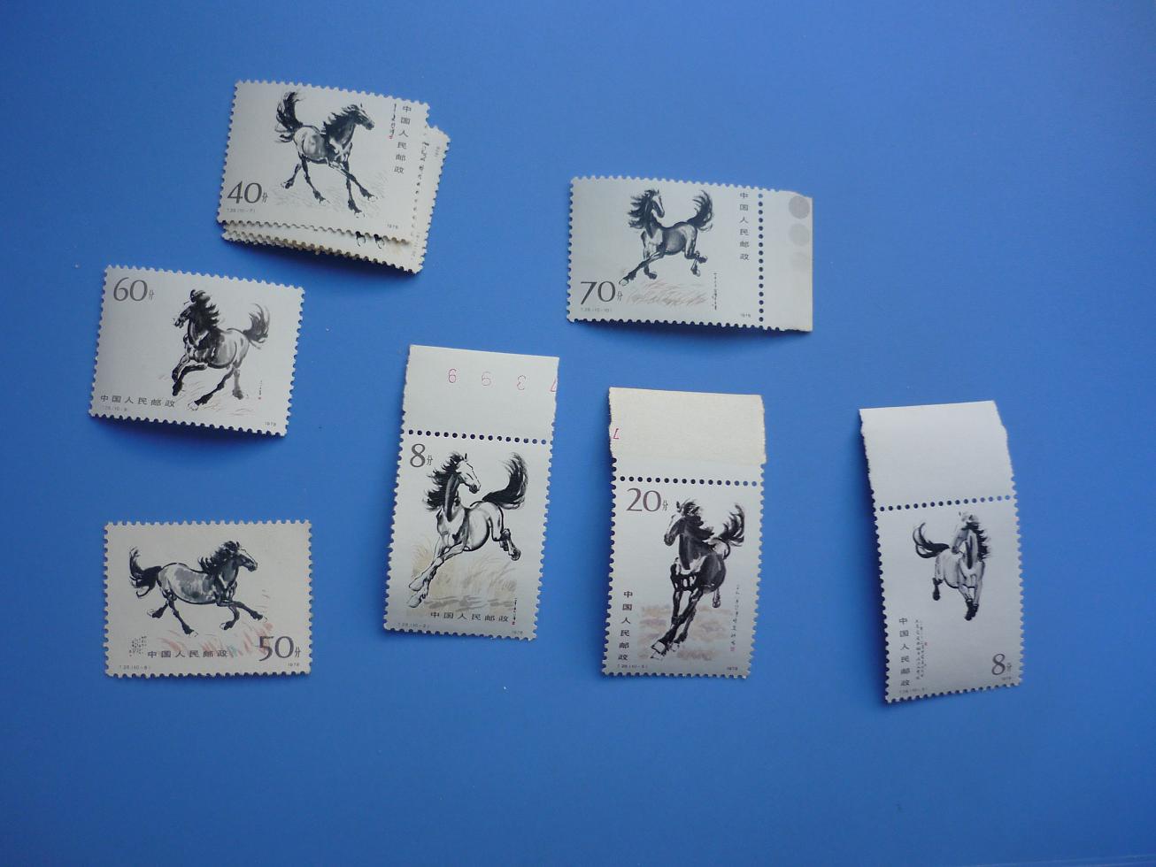 大批原胶微黄,-1软折及轻微铬痕,均不明显210,上大学上面一套原胶有黄,-5左下折,正面轻微漏白190,上大学下面一套原胶有黄,-5轻微弱齿,带角边的齿间不折196,奔马原胶微黄,50分轻微软折不明显,60分纸质点,正反轻微可见,其余除了微黄无其他问题,带边的齿间不折269,聂耳等八单枚均原胶,聂耳两枚均背轻微刮花,妇女节霉点,其余软折,带边的边折,八枚一起9,结束。