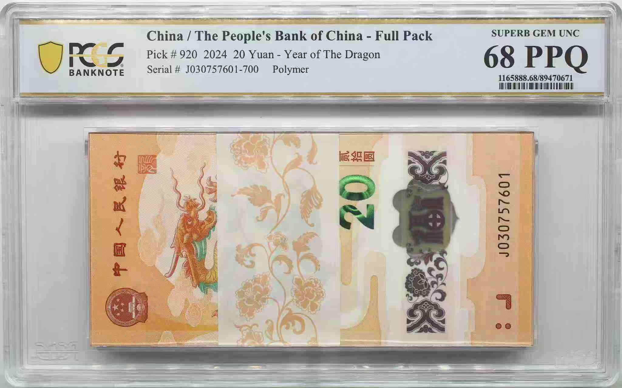 → 小龙钞无4尾601一刀,PCGS68