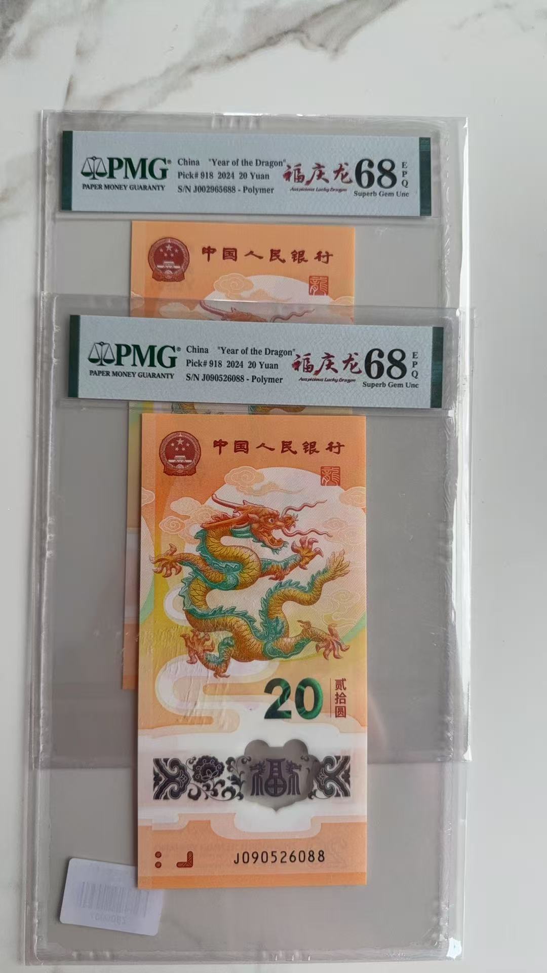 贺岁龙钞福庆龙标2张,pmg68分,号码002965688,090526088,2x2850,5700元先款包邮顺丰,不议价,微信看图确认,谢谢,微信153290967