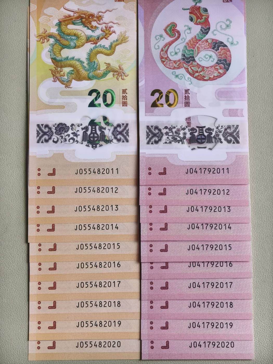 龙钞蛇钞年份号尾四同!2011-2020年份尾四同年份号标十!龙年蛇年马年都有,龙蛇都是满号!包邮不议价200/对一起出2000包邮顺丰!