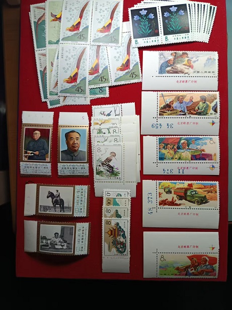 金鸡,原胶全品25.共8套。黑药植,原胶全品23。共4套。朱德,原胶全品过灯金亮。28。益鸟,原胶全品30。名楼,原胶全品10元。大寨红旗厂铭,原胶全品260元。