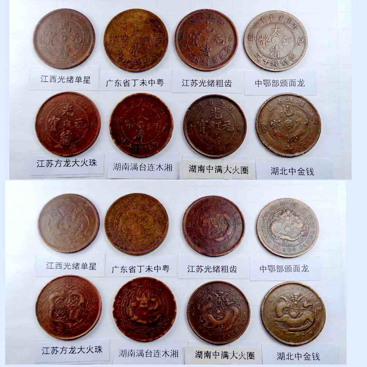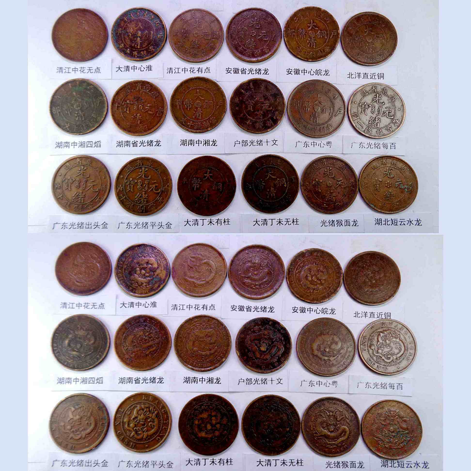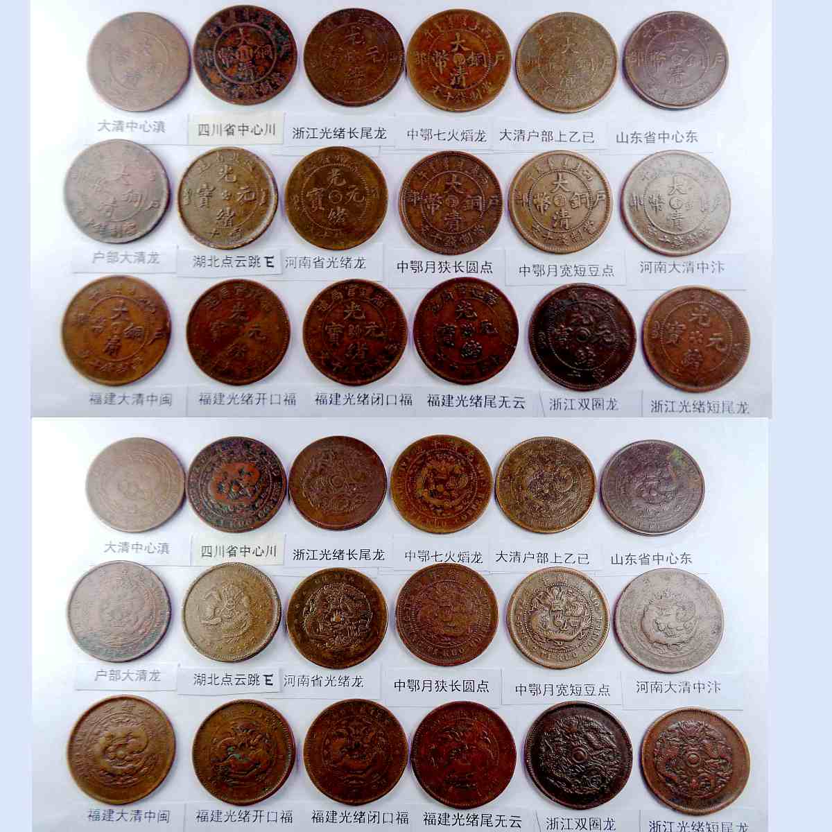 基本都是巧克力包浆,具体品种是: 江苏光绪龙 江苏光绪上乙已 江南光绪横乙已 江南横乙龙下点 大清双冠龙 湖北6路鳞龙 大清横已酉宣统 大清上已酉宣统 江南闭口甲辰 江南开口甲辰 北洋光绪龙 北洋直远铜 江南省双点癸 江南光绪壬寅 江南光绪上乙已 江南背长边花 湖北7路7刺龙 湖北7路9刺龙 清江中花无点 清江中心淮 清江中花有点 安徽省光绪龙 安徽中心皖 北洋直近铜 湖南中湘四焰 湖南省光绪龙 湖南中湘龙 户部光绪十文 广东中心粤 广东光绪每百 广东光绪平头金 广东光绪出头金 大清丁未有柱 大清丁未无柱 光绪猴面龙 湖北短云水龙 大清中心滇 四川省中心川 浙江光绪长尾龙 中鄂七火焰龙 大清户部上乙已 山东省中心东 户部大清龙 湖北点云跳E 河南省光绪龙 中鄂月狭长圆点 中鄂月宽短豆点 河南大清中汴 福建大清中闽 福建光绪开口福 福建光绪闭口福 福建光绪尾无云 浙江双圈龙 浙江光绪短尾龙 江苏省中心苏 山东省光绪龙 丙午有台阴宁 戊申有台阴宁 湖北水龙高剌 大清无台阳宁 江西大清中赣 江西光绪双星 湖北高满肥龙 湖北水龙低剌 丁未有台阴宁 湖北低满肥龙 大清丁未二十文 户部光绪二十文 已酉宣统二十文 中直妨部颁龙 江西光绪单星 广东省丁未中粤 江苏光绪粗齿 中鄂部颁面龙 江苏方龙大火珠 湖南满台连木湘 湖南中满大火珠 湖北中金钱 。