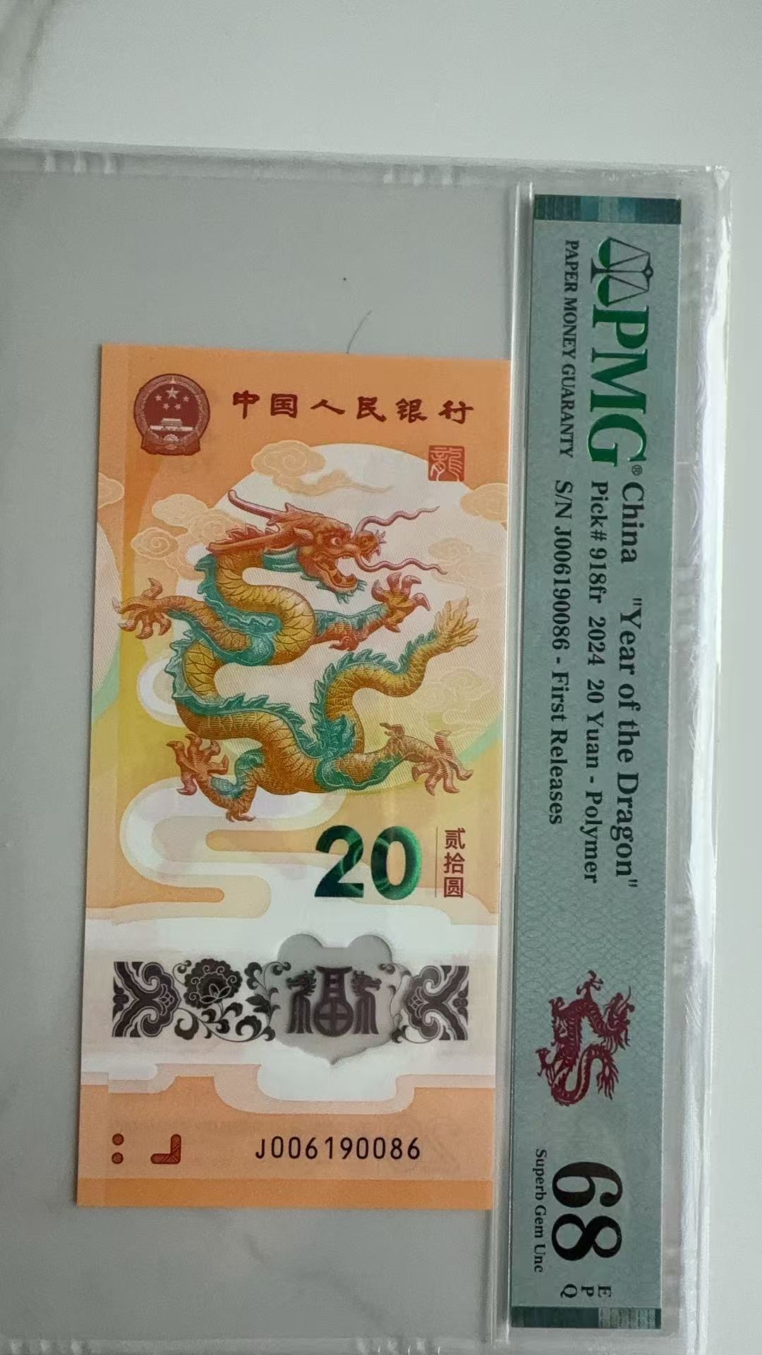 贺岁龙钞首期倒置,号码006190086,PMG68分,2888元先款包邮顺丰,不议价,微信看图确认,谢谢,微信15329096777