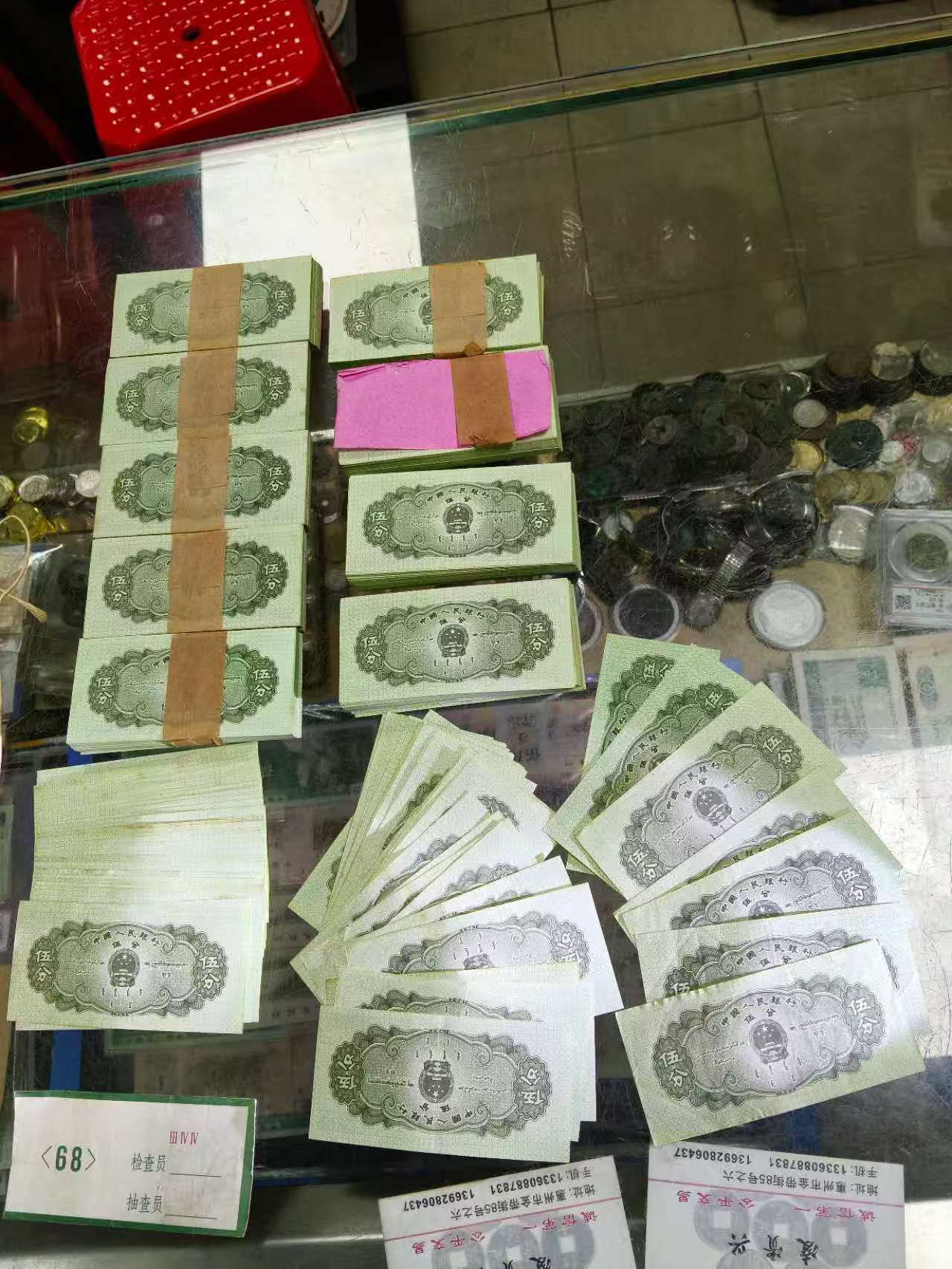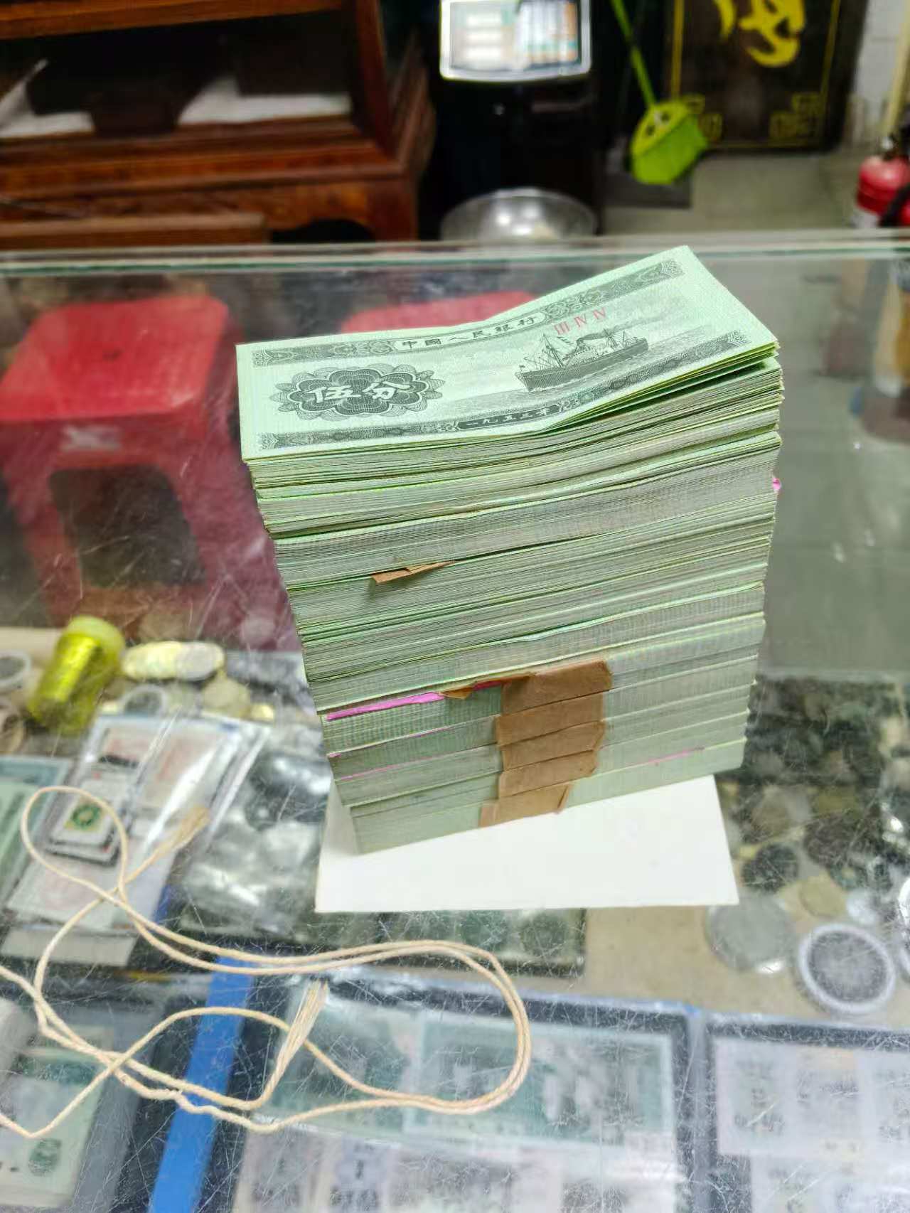 → 出原票5分纸币一捆有黄斑如图