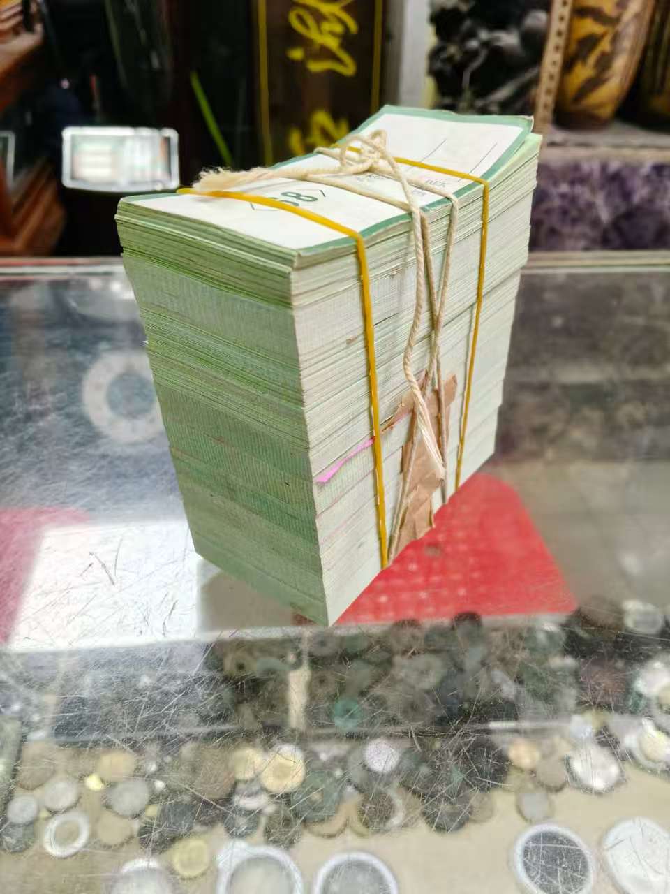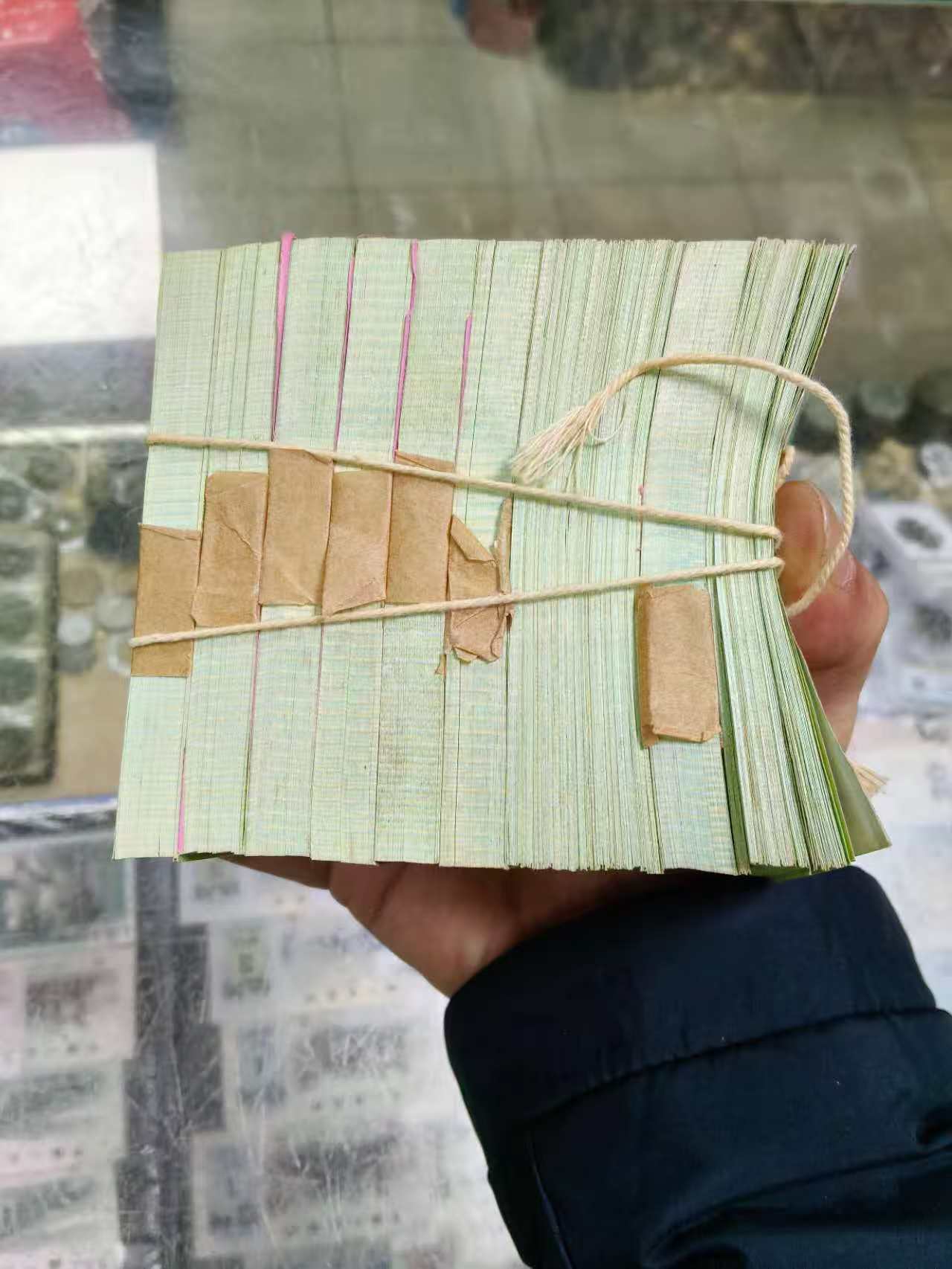 出原票5分纸币一捆有黄斑如图打开数过有9刀整齐.1刀有40张软折品拼了7张如图通走售4950元