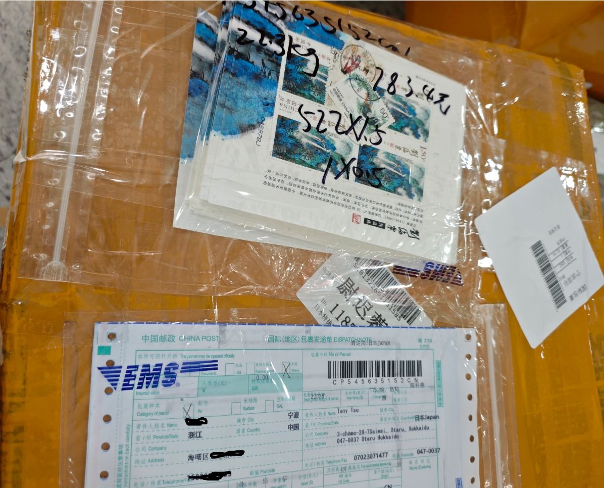 这个包裹袋装有刘海粟1.5元X4小版张130张780元面值邮票,不用贴票,盖戳直接装袋,发日本