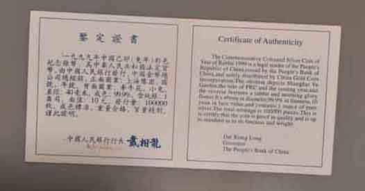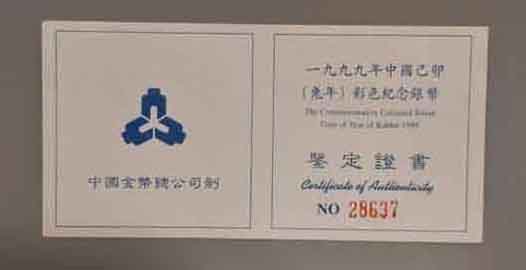 → 1999年兔年一盎司彩银币,带证书