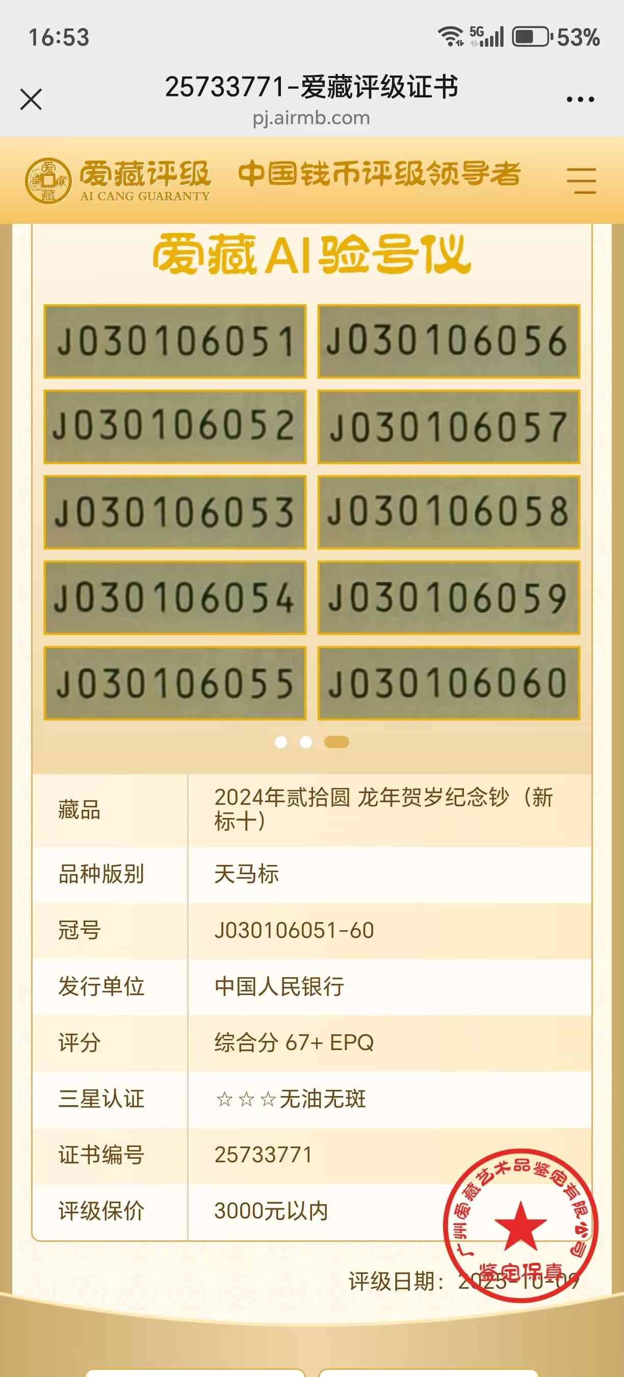 标十号码为:030106051,最后一张大击鼓传花030106060,标十价格为7800元,电联确认
